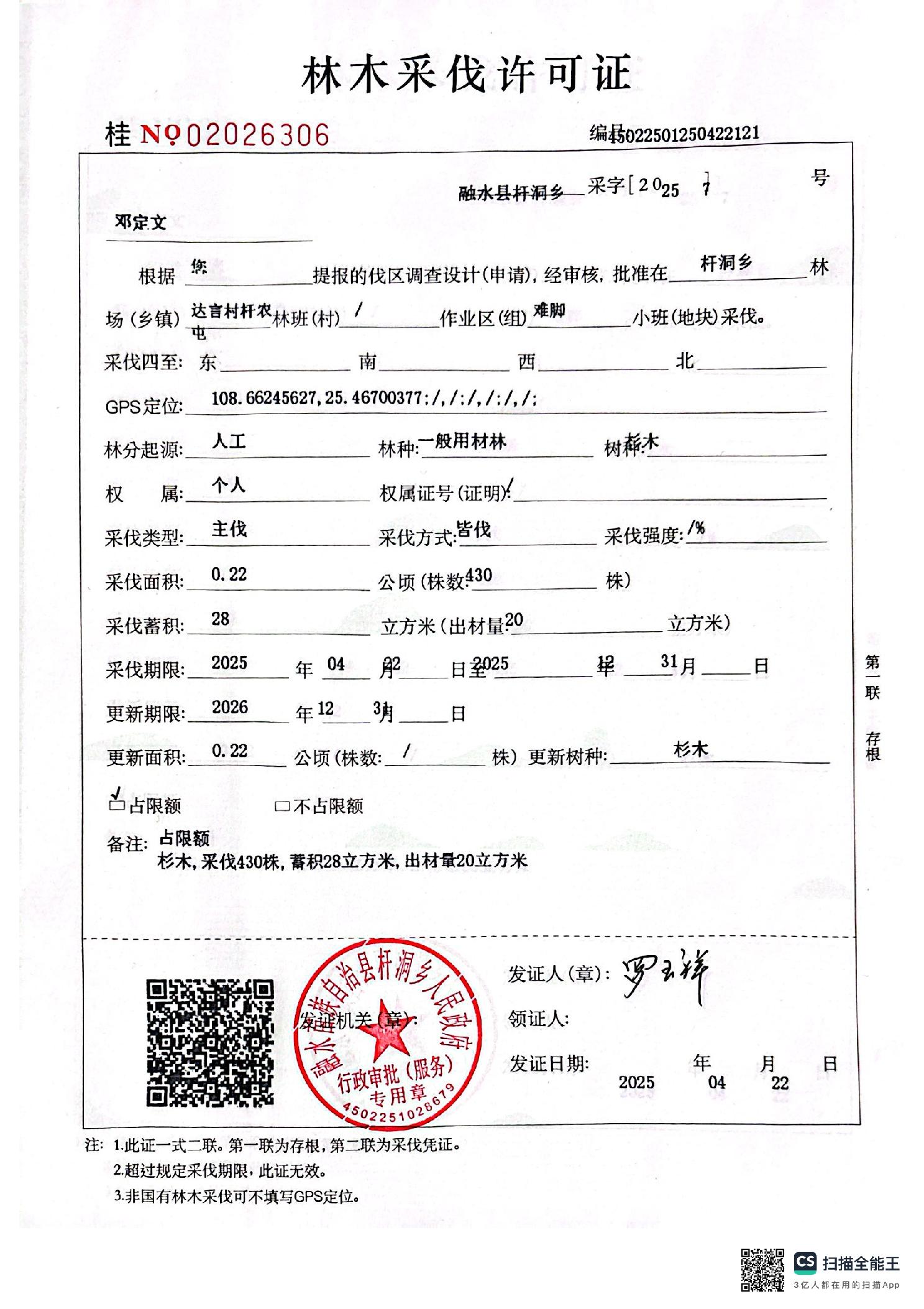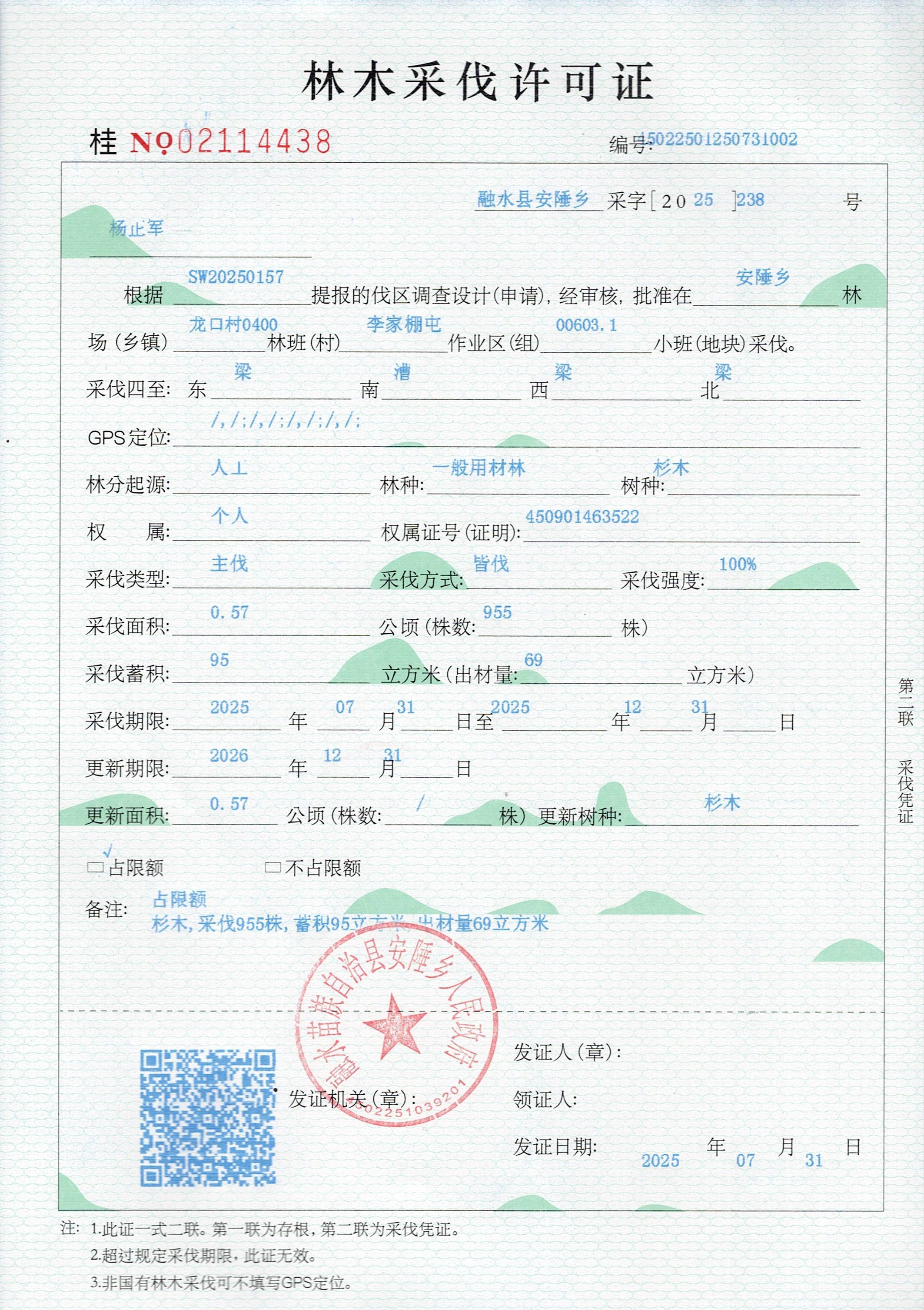 林木采伐许可证:门老谁 (桂NO 03137720)
