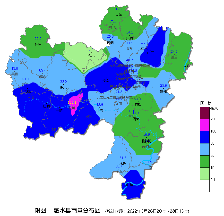 图1 2022年5月26日20时~28日15时融水县雨量分布图