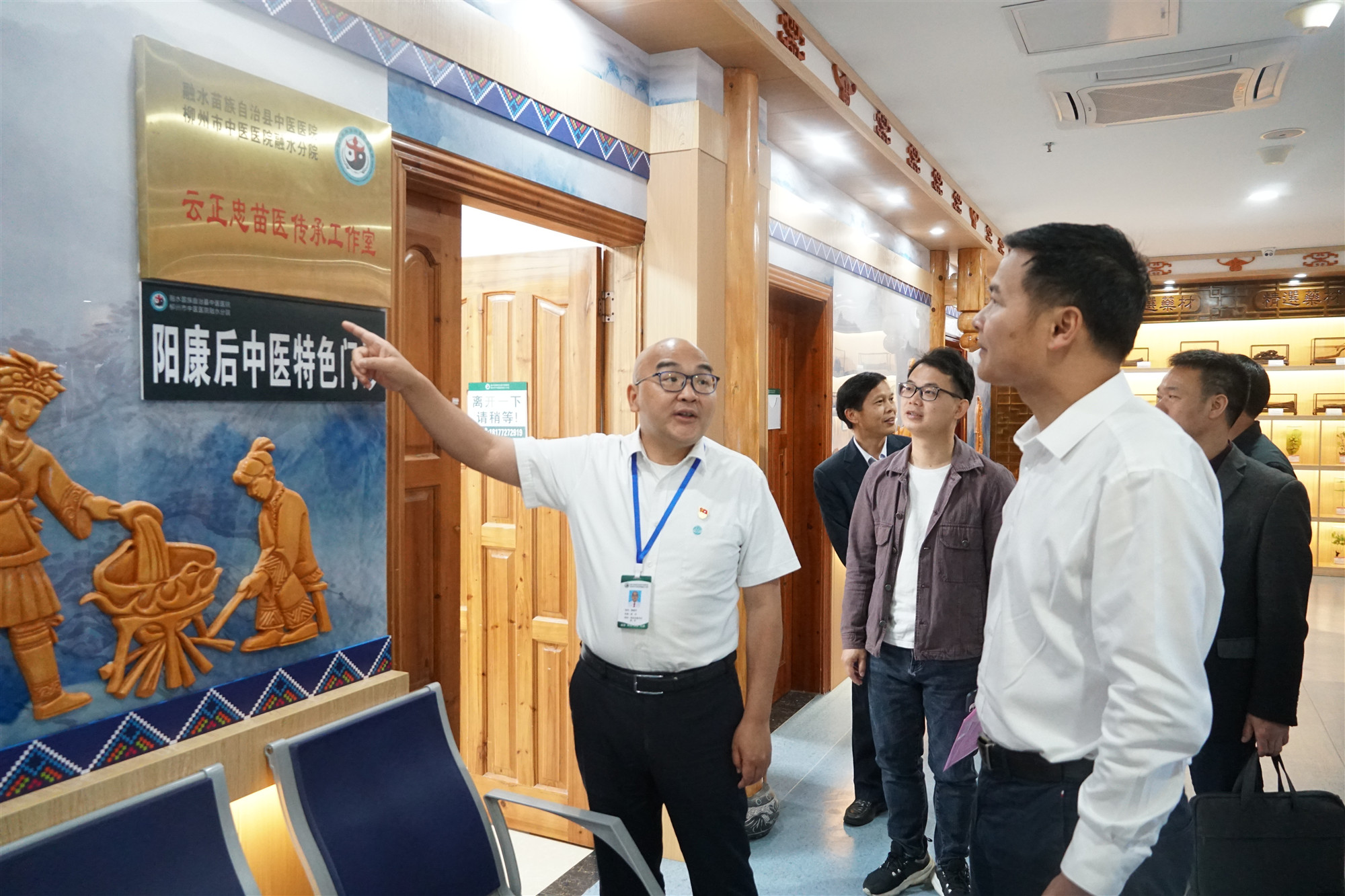 ▲刘金纪(右一)在融水中医医院实地查看该院名中医工作室