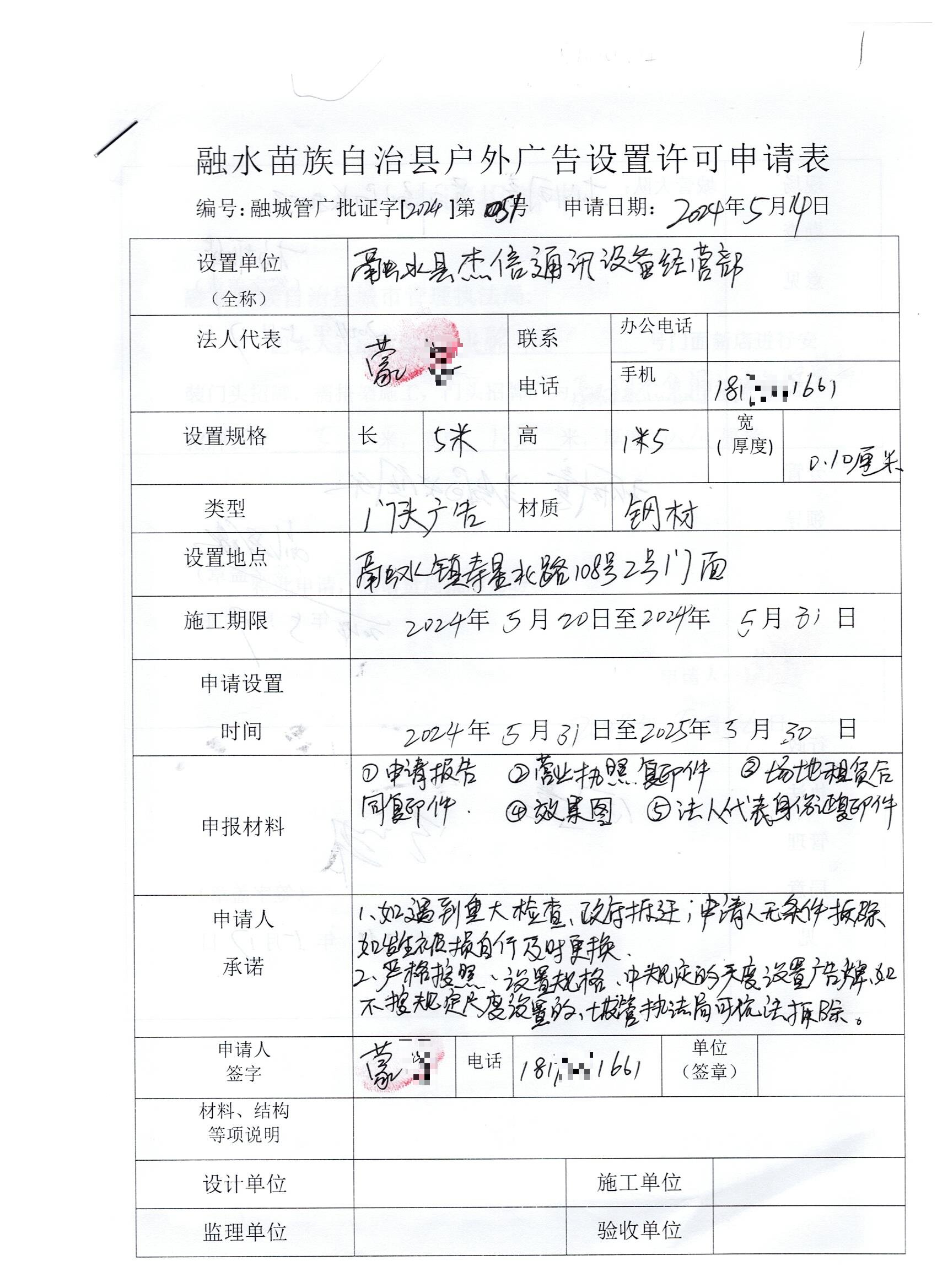 行政审批许可表(融城管许2024051)号受融水县审批局委托事项