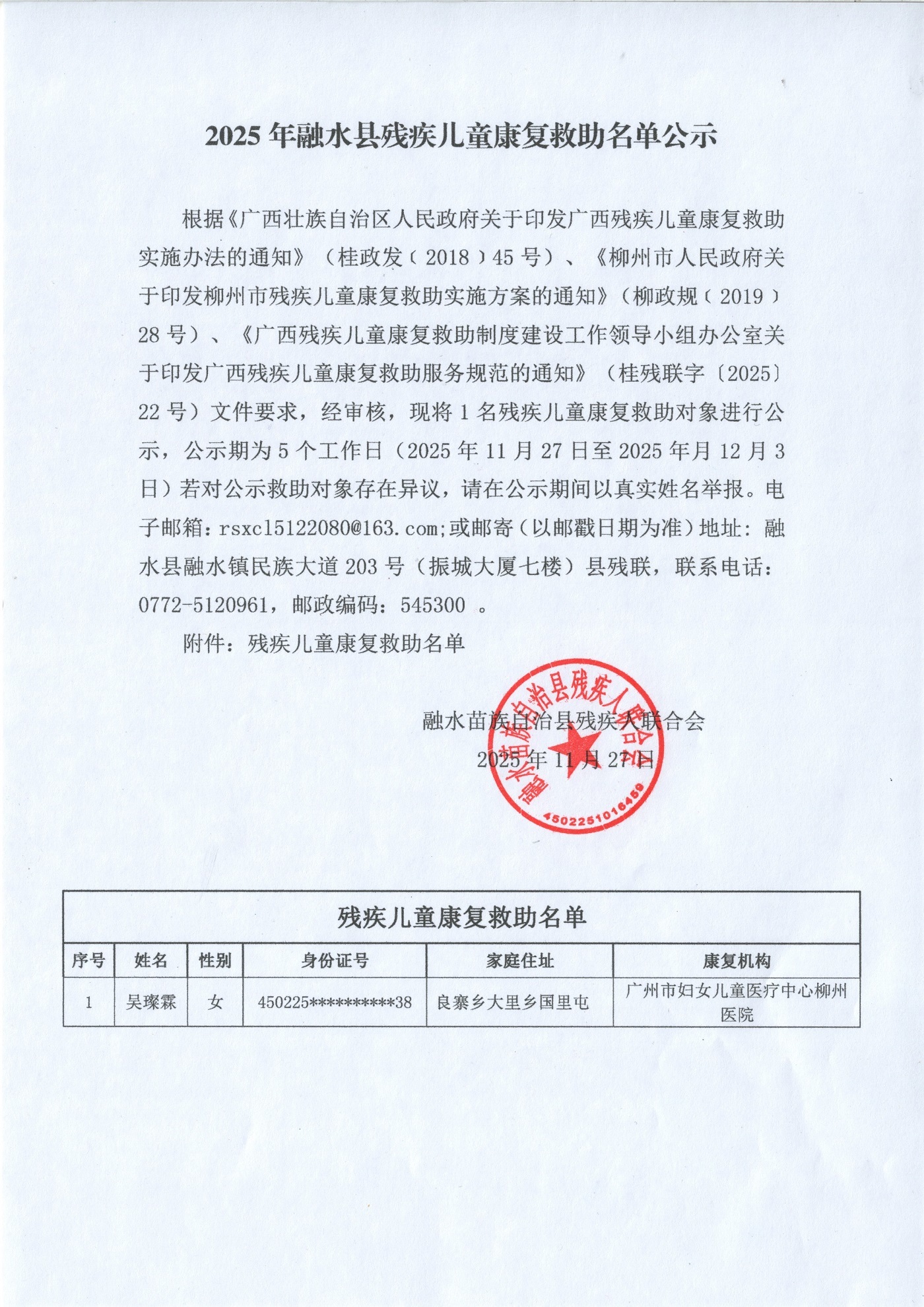 2025年融水县残疾儿童康复救助名单公示2025.11.27