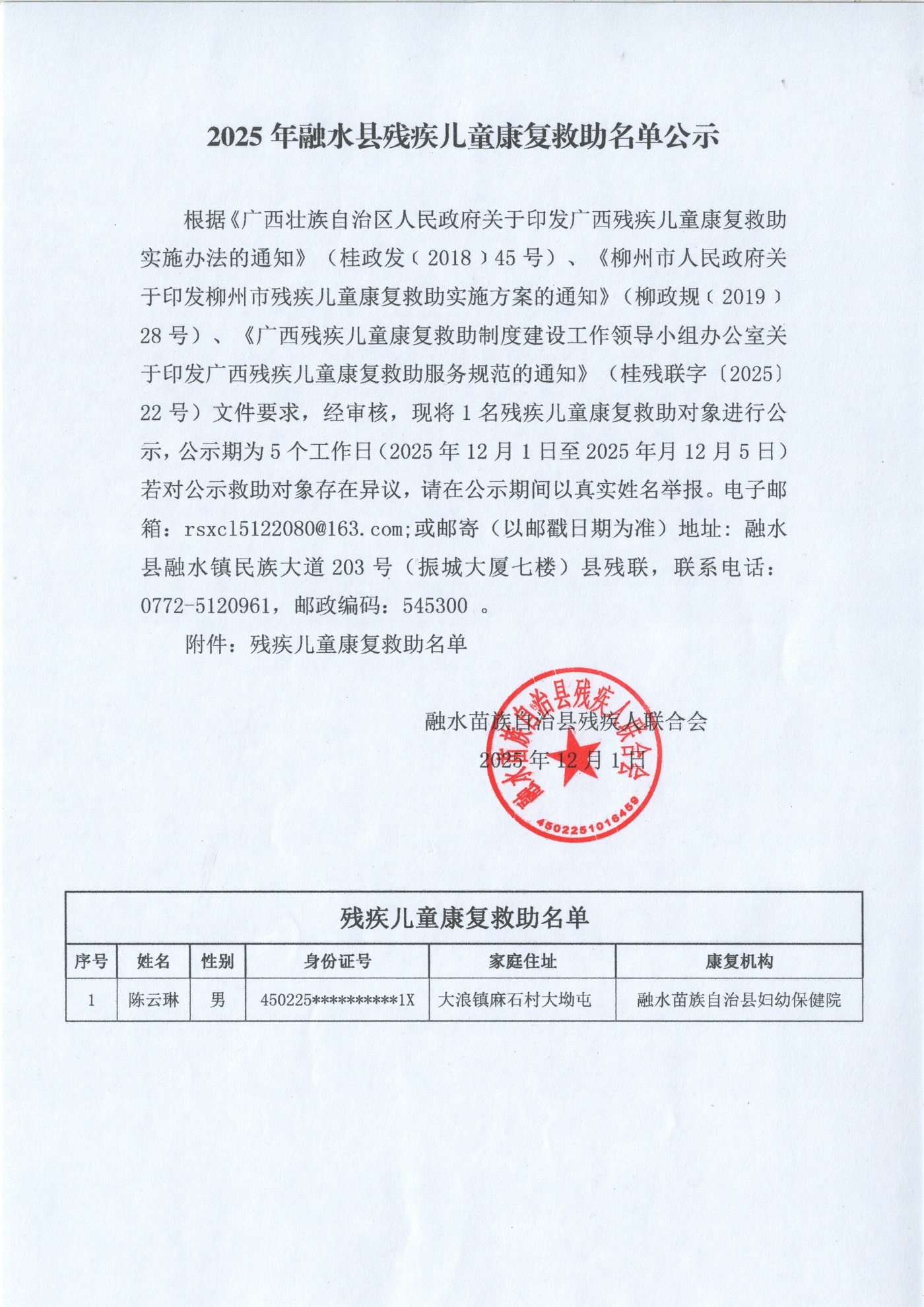 2025年融水县残疾儿童康复救助名单公示2025.12.1