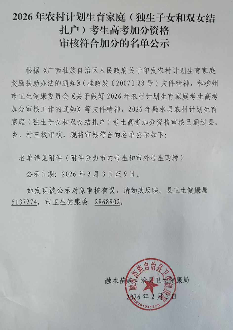 2026年农村计划生育家庭(独生子女和双女结扎户)考生高考加分资格审核符合加分的名单公示