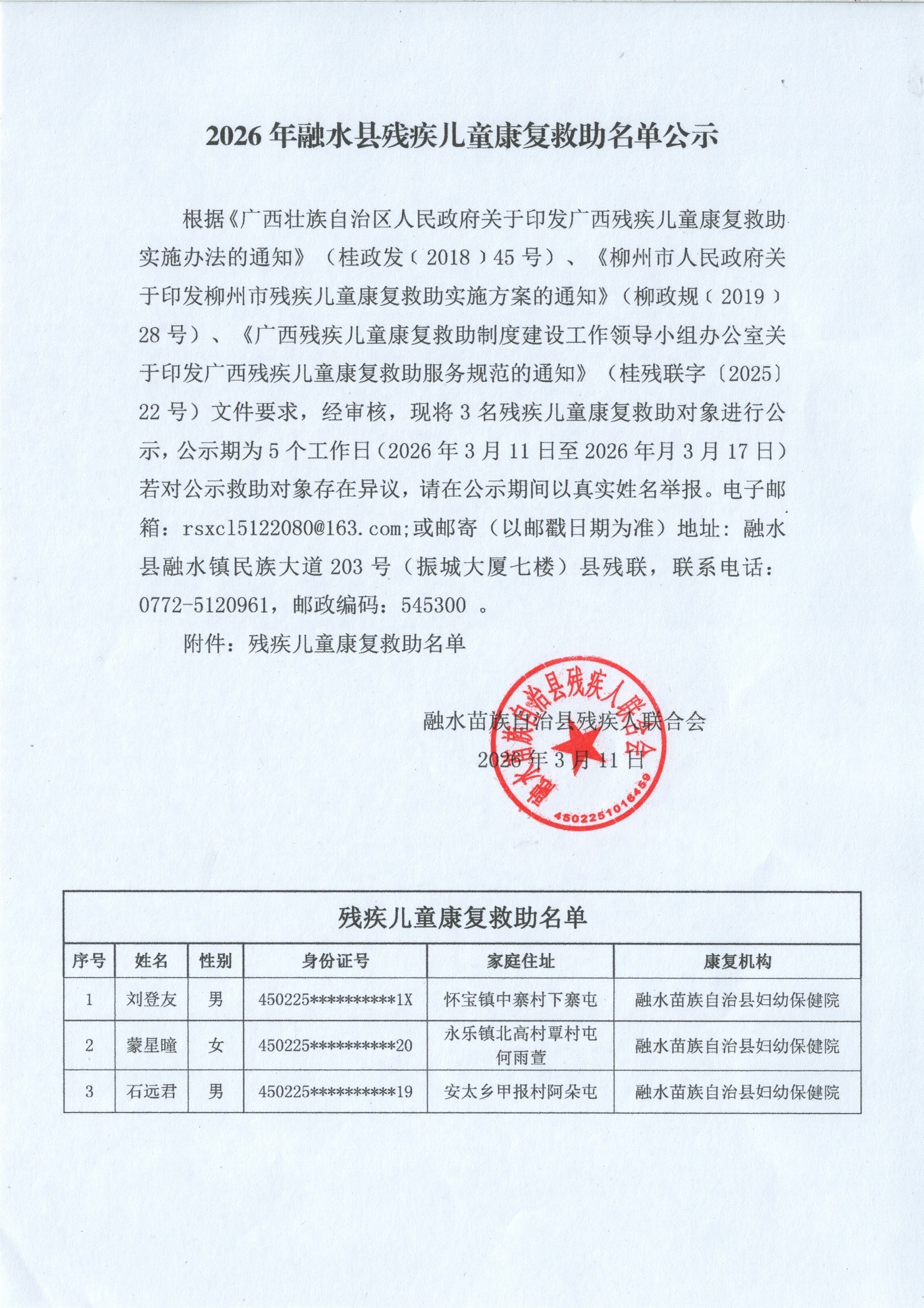 2026年融水县残疾儿童康复救助名单公示2026.3.11