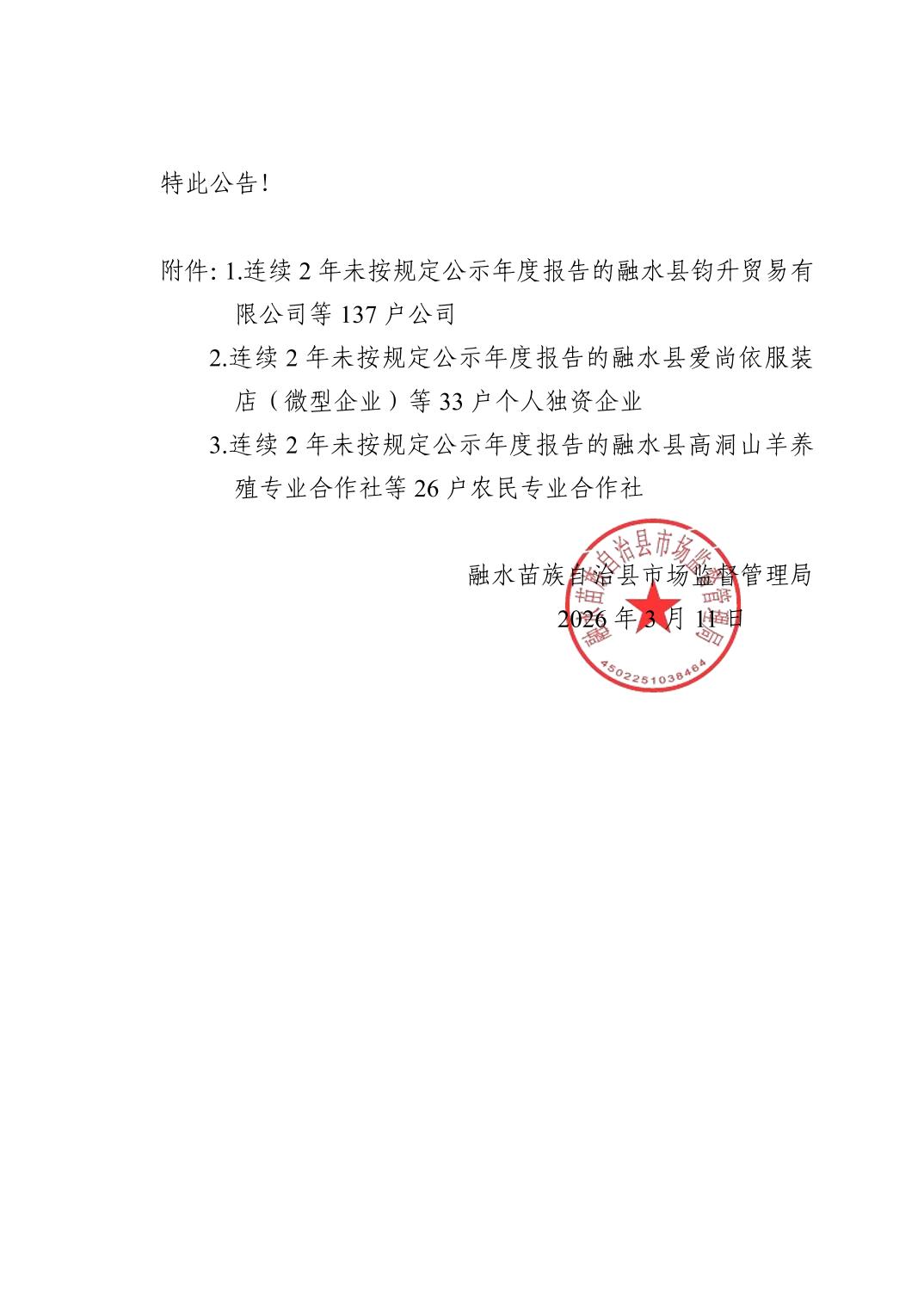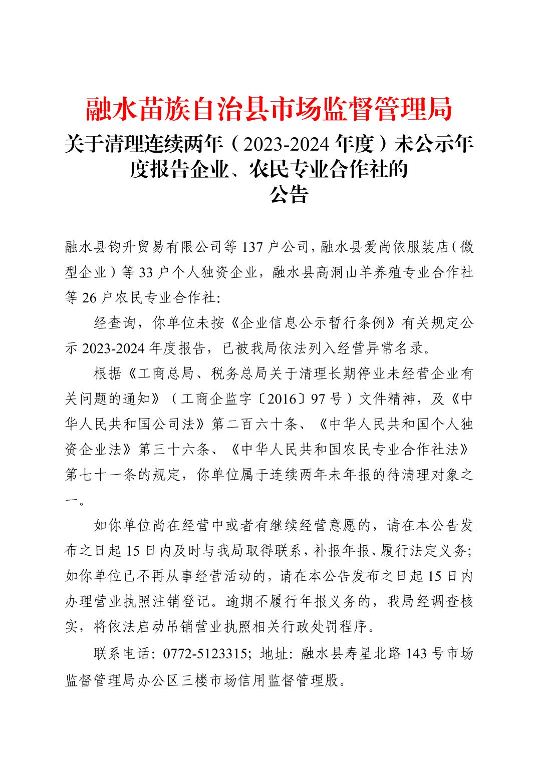 融水苗族自治县市场监督管理局关于清理连续两年(2023-2024年度)未公示年度报告企业、农民专业合作社的公告