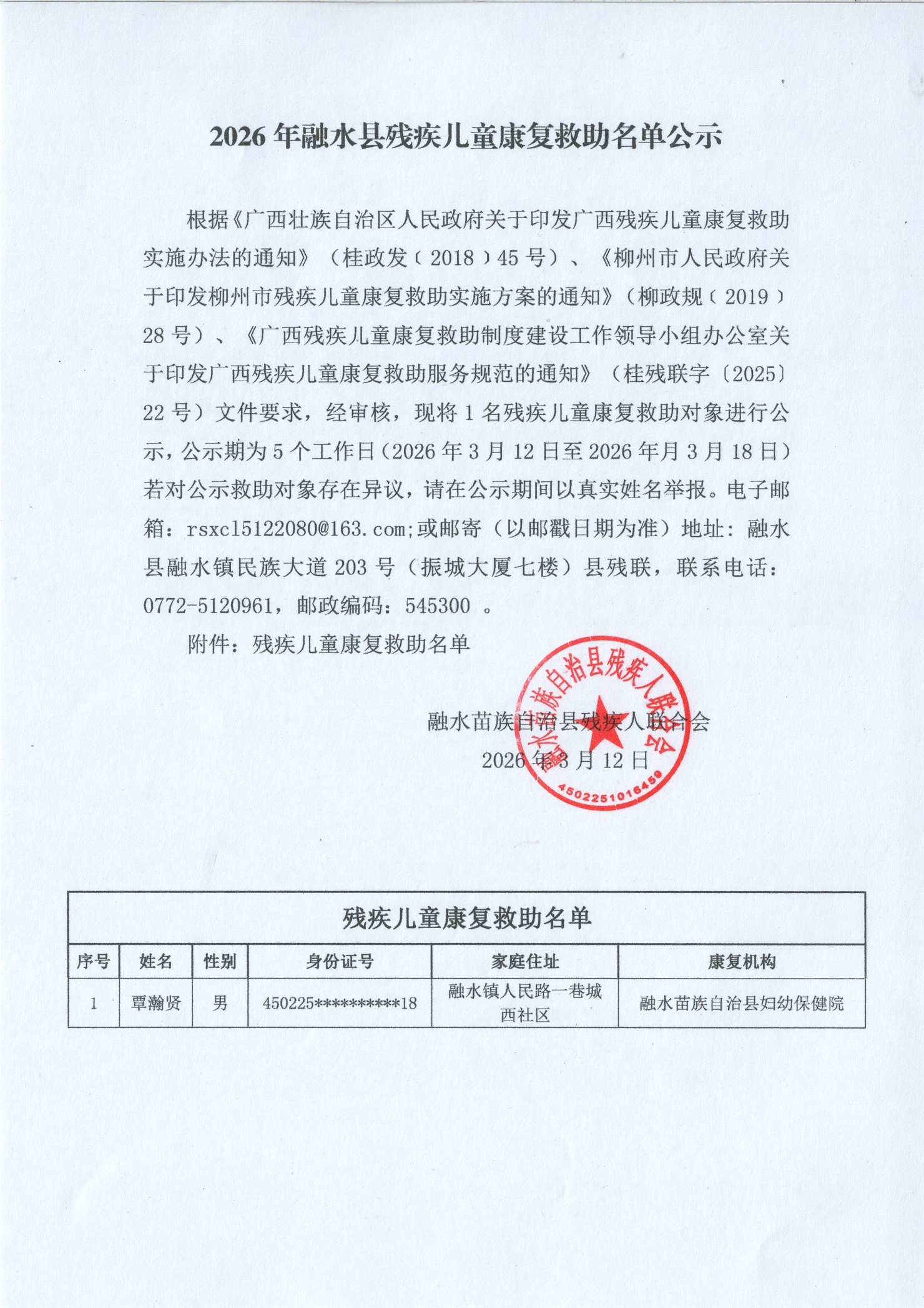 2026年融水县残疾儿童康复救助名单公示2026.3.12