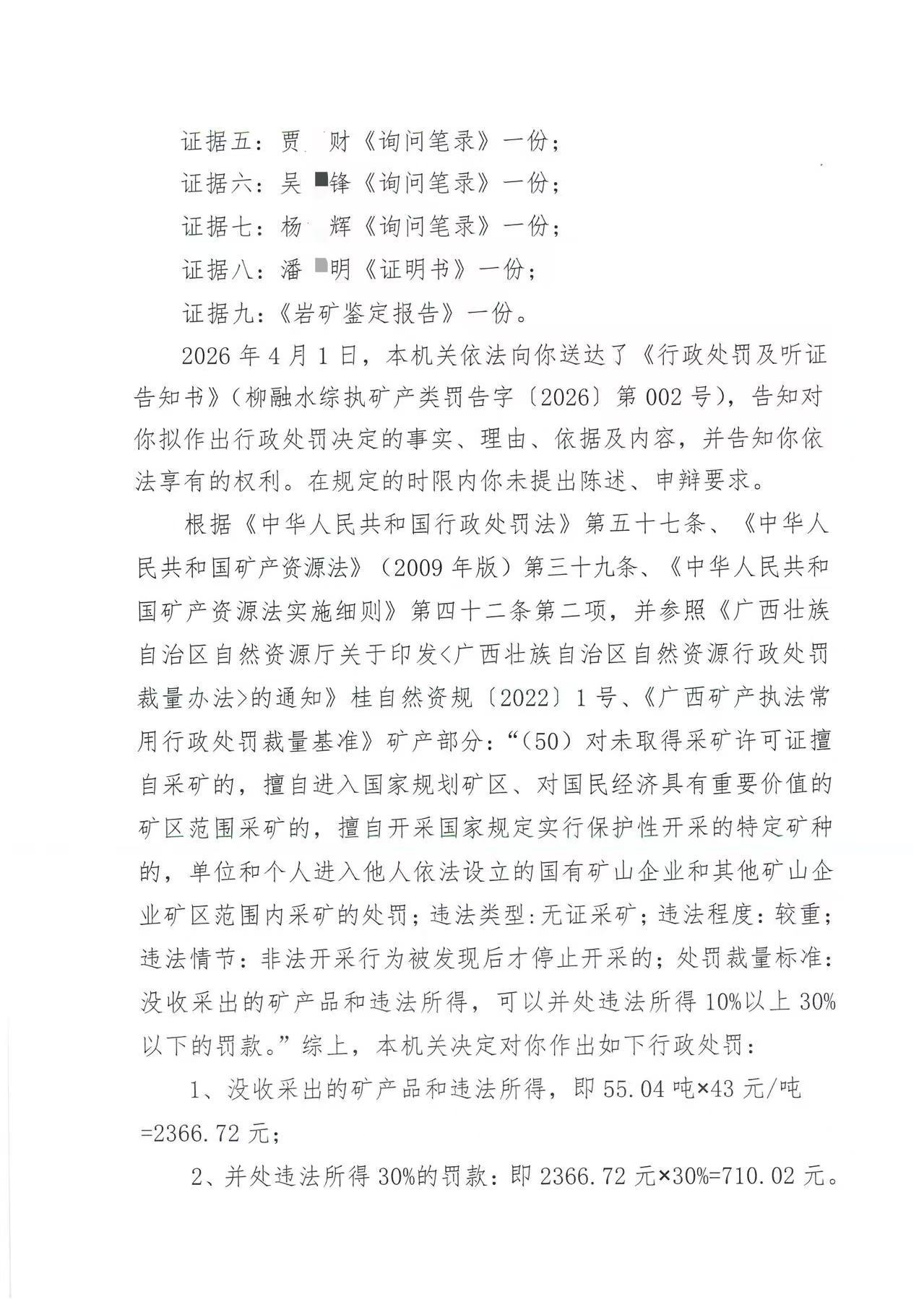 柳融水综执矿产类罚决字〔2026〕第002号