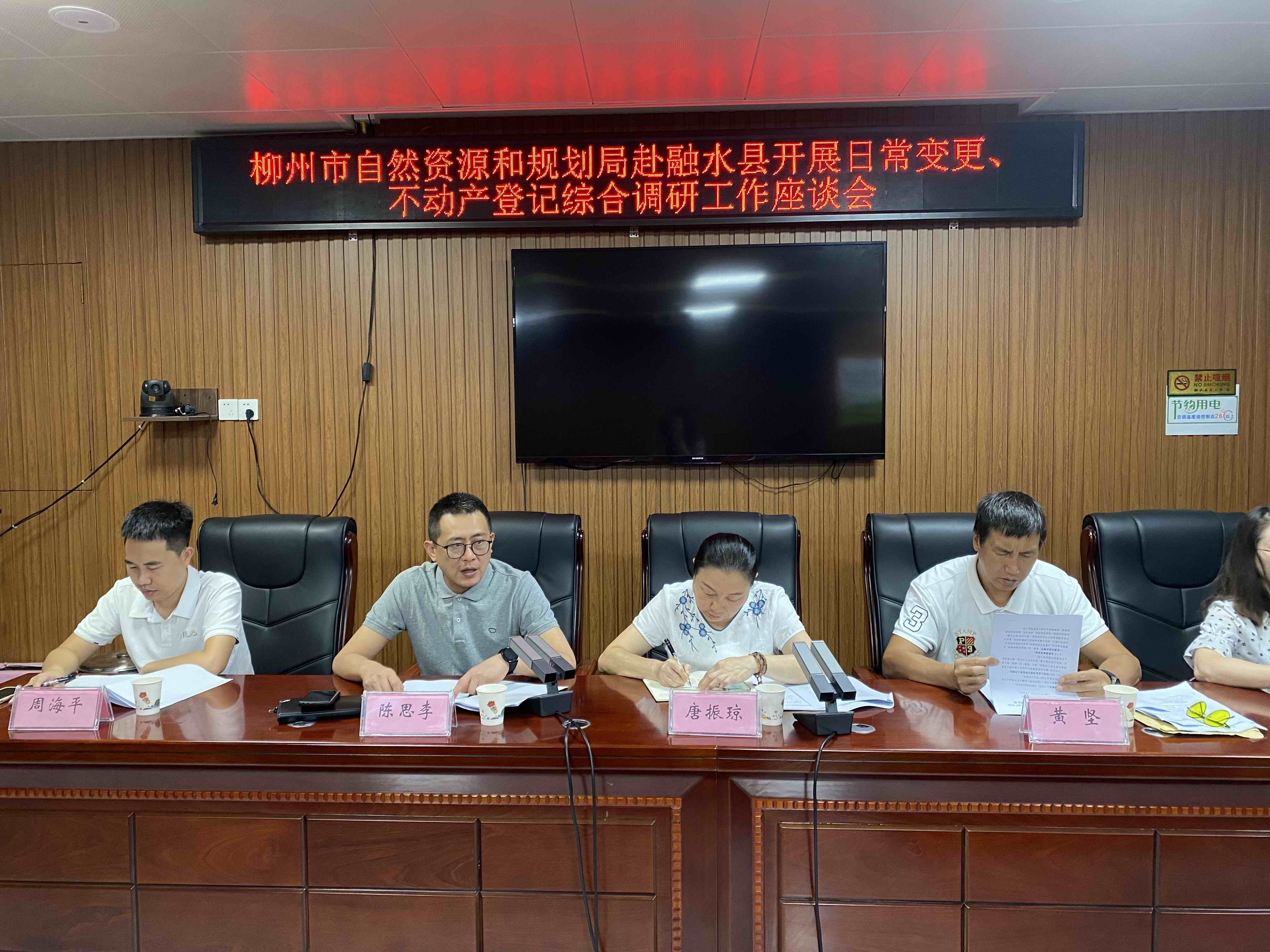 8月18日,柳州市自然资源和规划局到融水县自然资源和规划局召开2023年融水县日常变更、不动产登记综合调研工作座谈会。市局党组成员、总工程师唐振琼同志、市不动产登记中心党总支书记黄坚同志、融水县副县长陈思李同志、县自然规划局局长叶林峰同志参加会议。