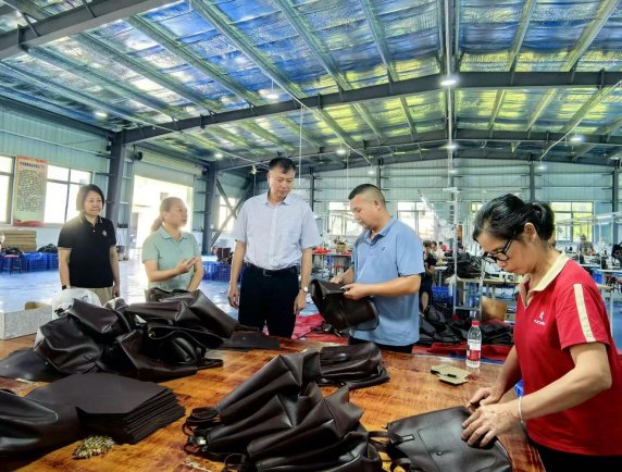 图为在怀宝镇中寨社区集体经济箱包厂调研(韦彦波摄)