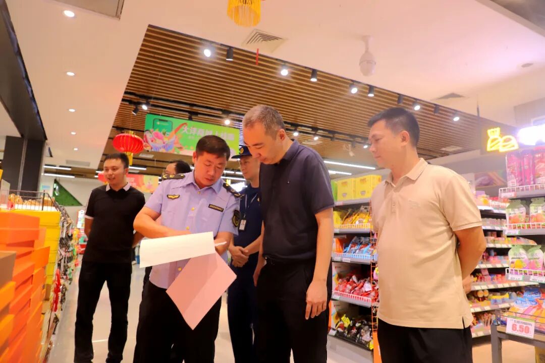 在水东大洋超市内,周峰询问月饼、生鲜等应节商品的进货渠道、质量管控及保质期管理,核查供货商资质与产品合格证明。他要求超市落实进货查验制度,确保食品溯源可控,营造放心消费环境。