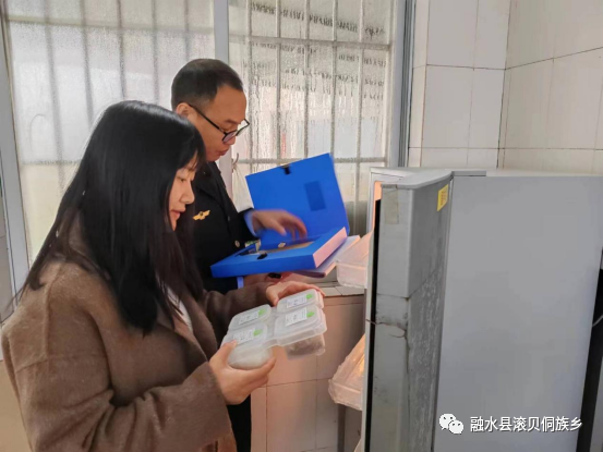▲莫苑(左一)在查看学校食堂留样