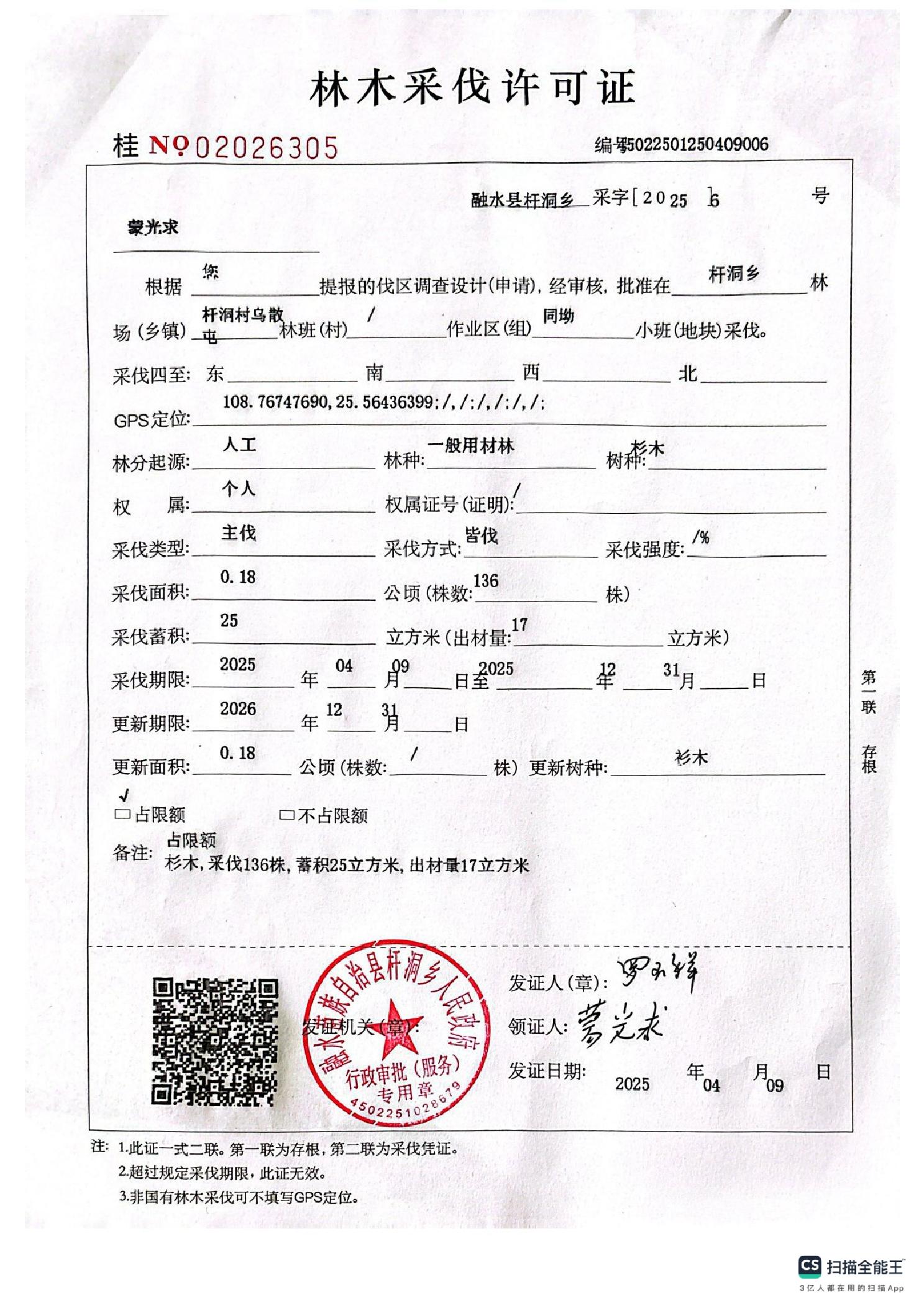 林木采伐许可证:蒙光求(桂NO.02026305)号公示