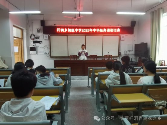 杆洞乡初级中学举办中华经典诵读比赛。学生们依次登台演绎《诗经·蒹葭》《岳阳楼记》等名篇。在“双语诵读”环节,师生用苗语、普通话交替朗诵《离骚》节选,通过“集体齐诵+创意展演”形式,展现民族文化与经典阅读的深度融合。