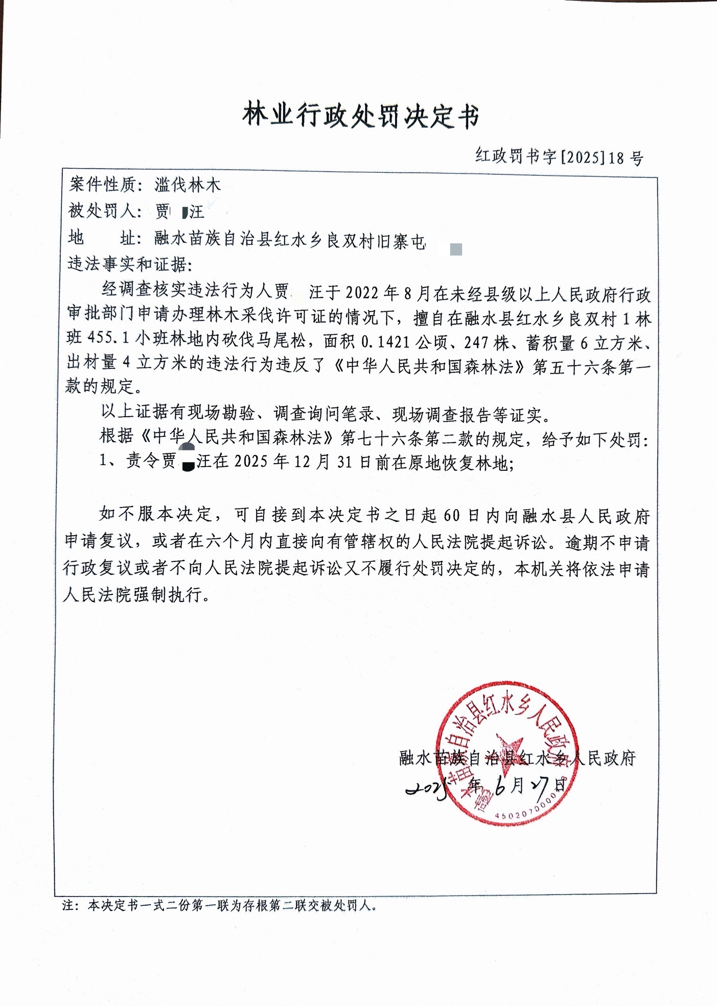 林业行政处罚决定书(红政罚书字【2025】18号)