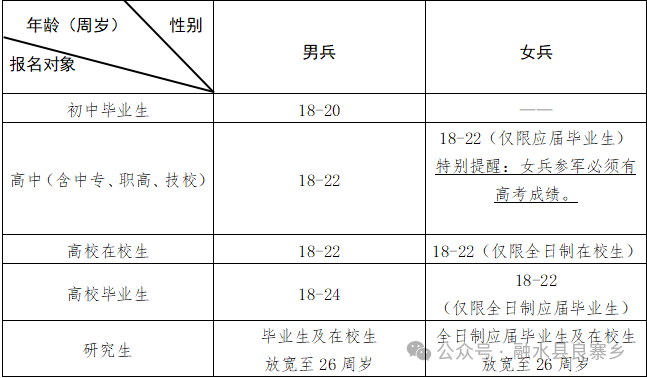 应征报名统一采取网上报名的方式,网址:全国征兵网http://www.gfbzb.gov.cn。当年12月31日前年满18岁的男性公民,应当按照法律规定履行兵役登记义务。已经参加过兵役登记的,应当登录全国征兵网进行兵役登记核验。未能上网登记的青年,也可到本人常住户口所在乡镇武装部,由工作人员协助进行网上报名登记。01网上报名→02初审初检→03体格政考→04走访调查→05役前教育→06预定新兵→07张榜公示→08批准入伍。