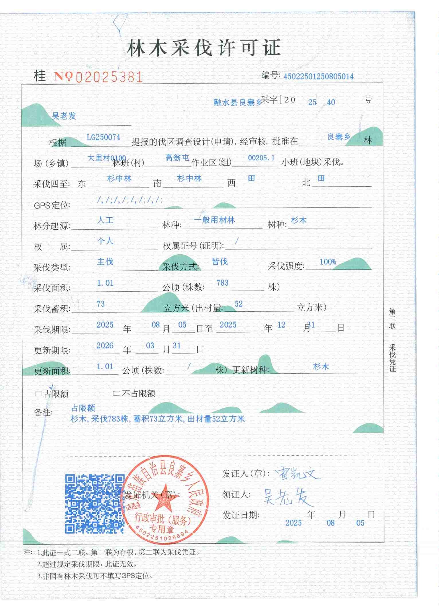林木采伐许可证:吴老发 (桂NO 02025381)