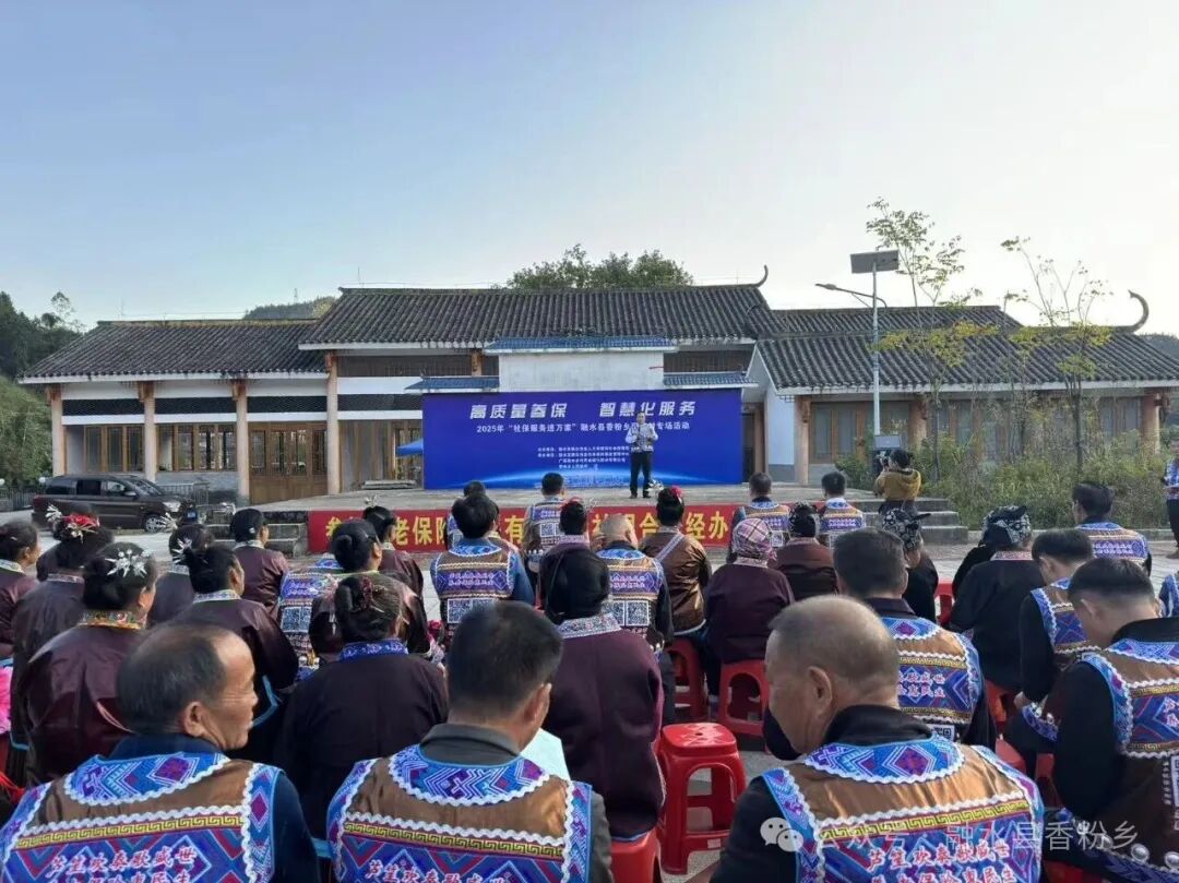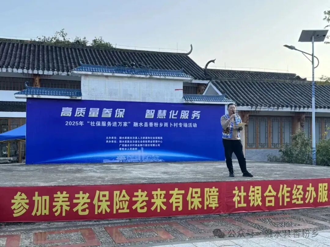为推动社保服务精准化、智慧化,助力乡村振兴战略落地,10月27日下午,2025年“社保服务进万家”融水苗族自治县专场活动在香粉乡雨卜村成功举办。活动以“高质量参保,智慧化服务”为主题,通过政策宣讲、互动问答、文艺表演等形式,将社保服务送到群众“家门口”,吸引村民积极参与。