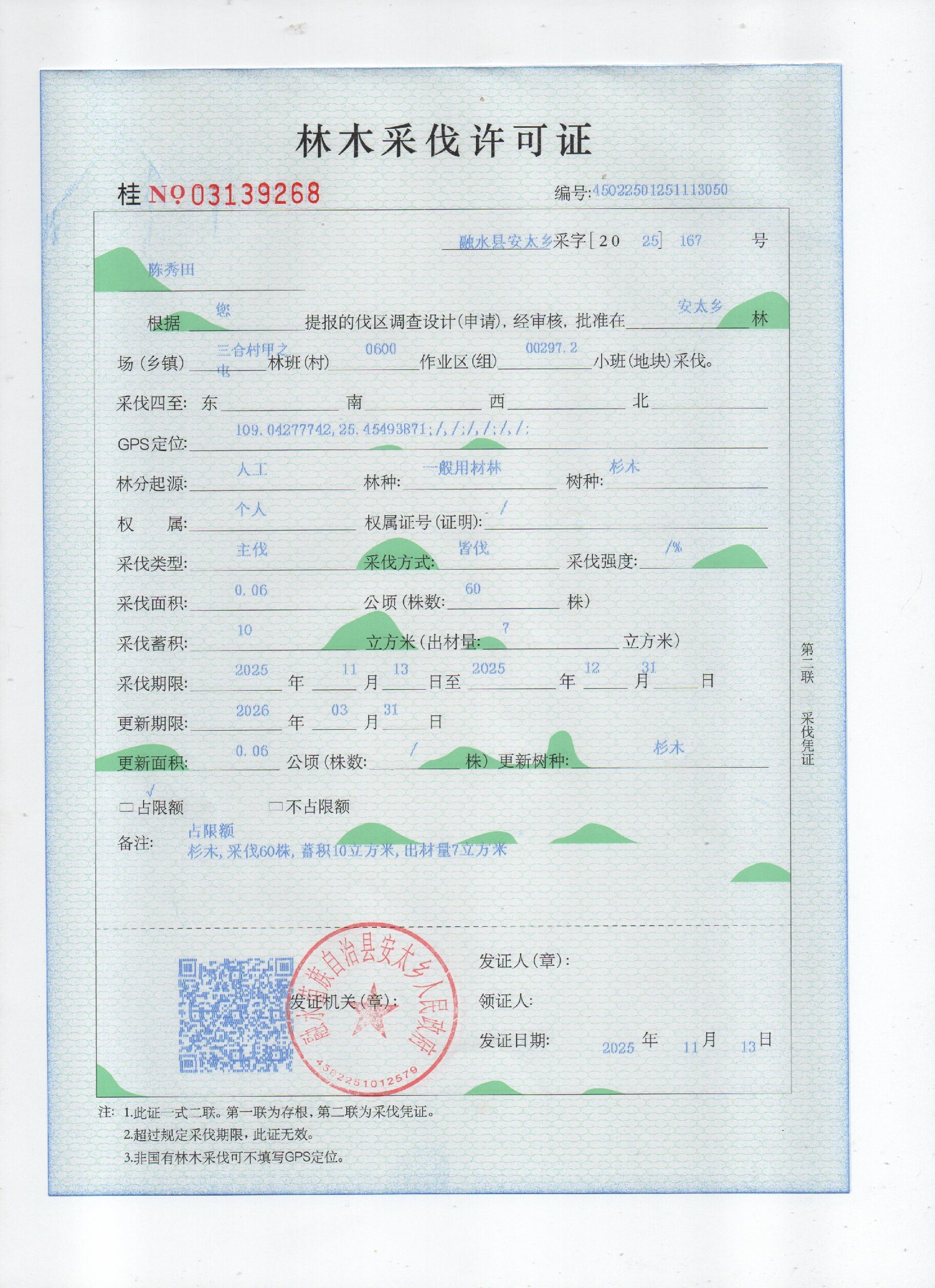 林木采伐许可证:陈秀田(桂NO.03139268)公示