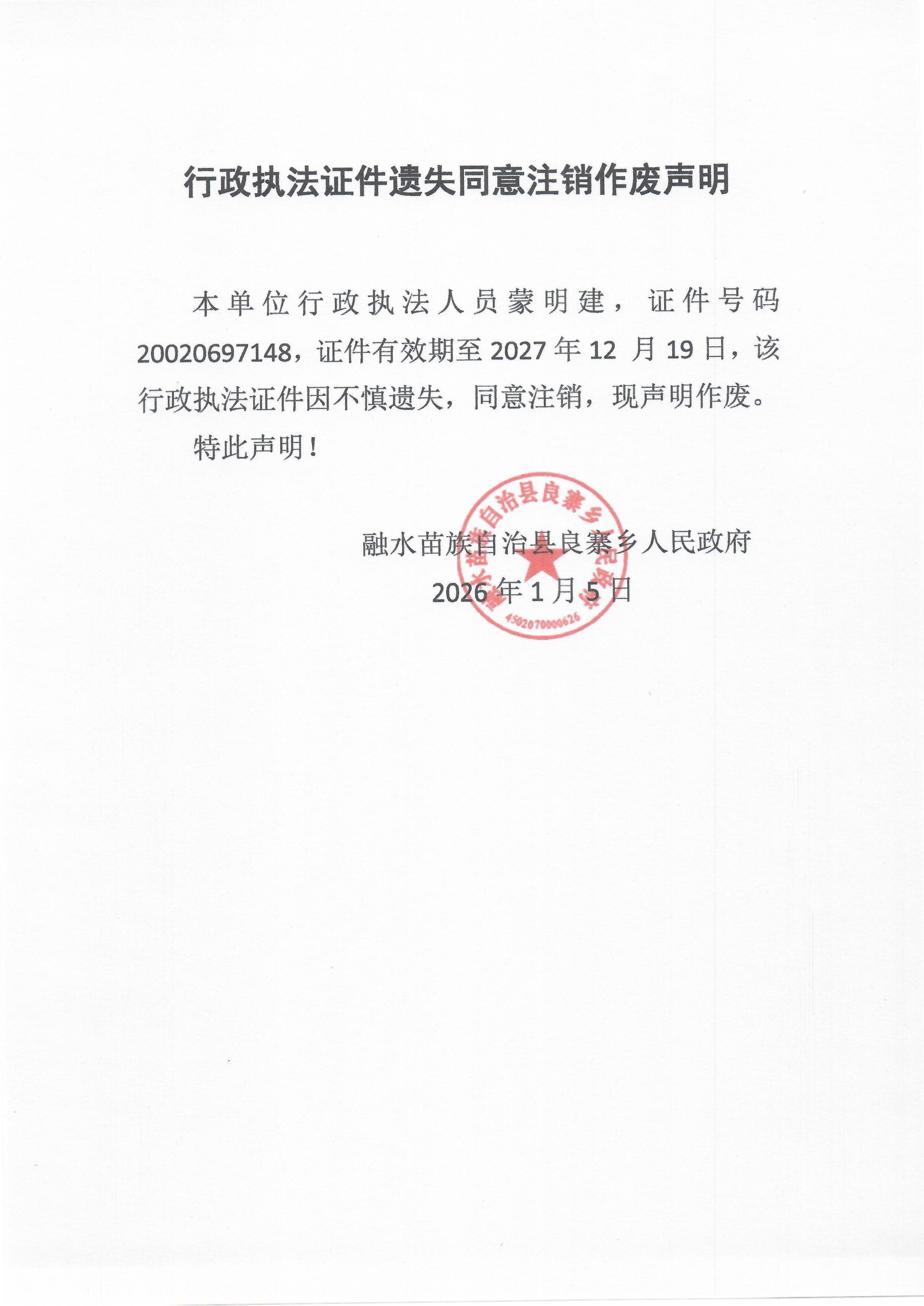 行政执法证件遗失同意注销作废声明