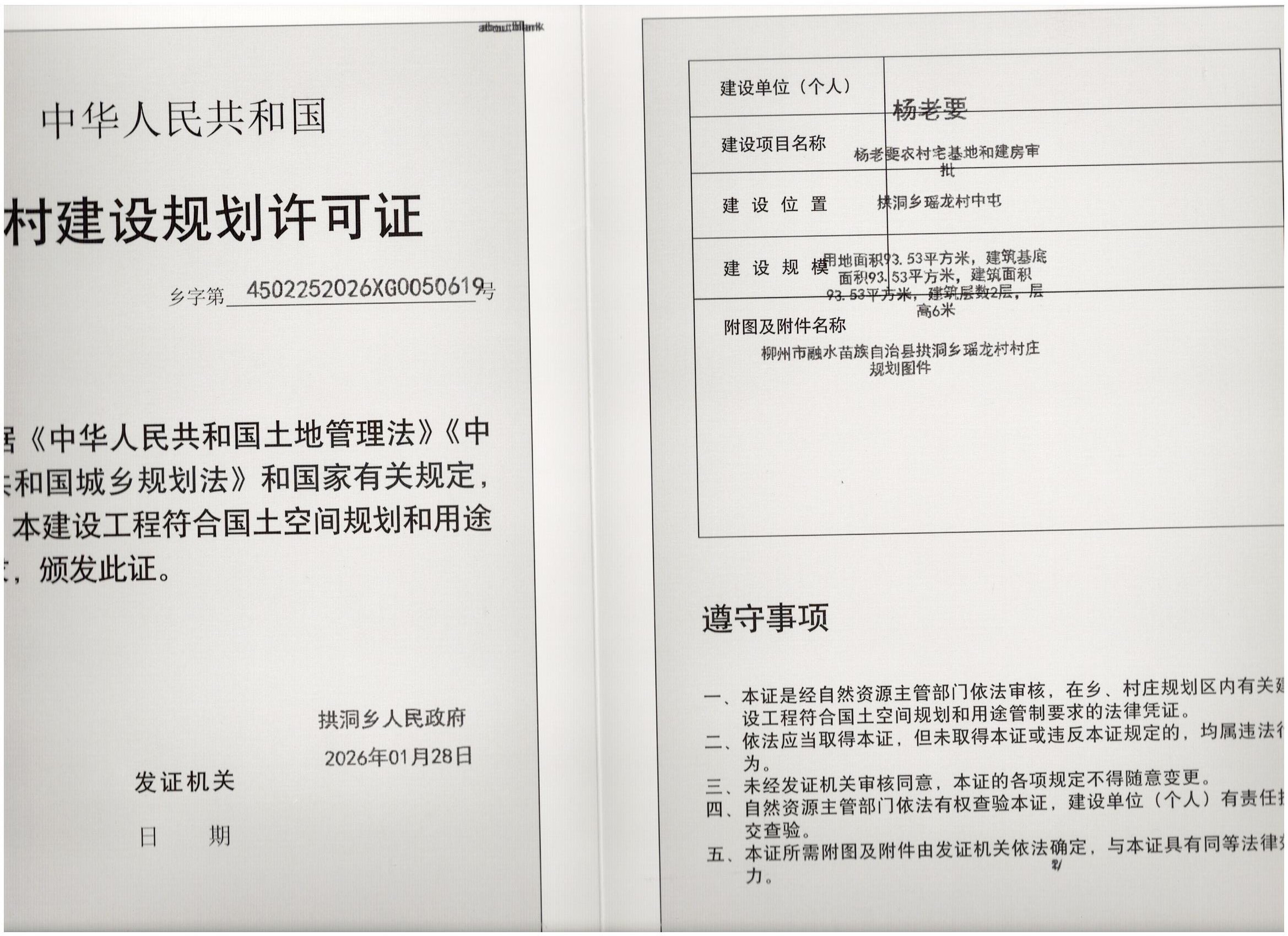 乡村建设规划许可证:乡字第4502252026XG0050619号文件