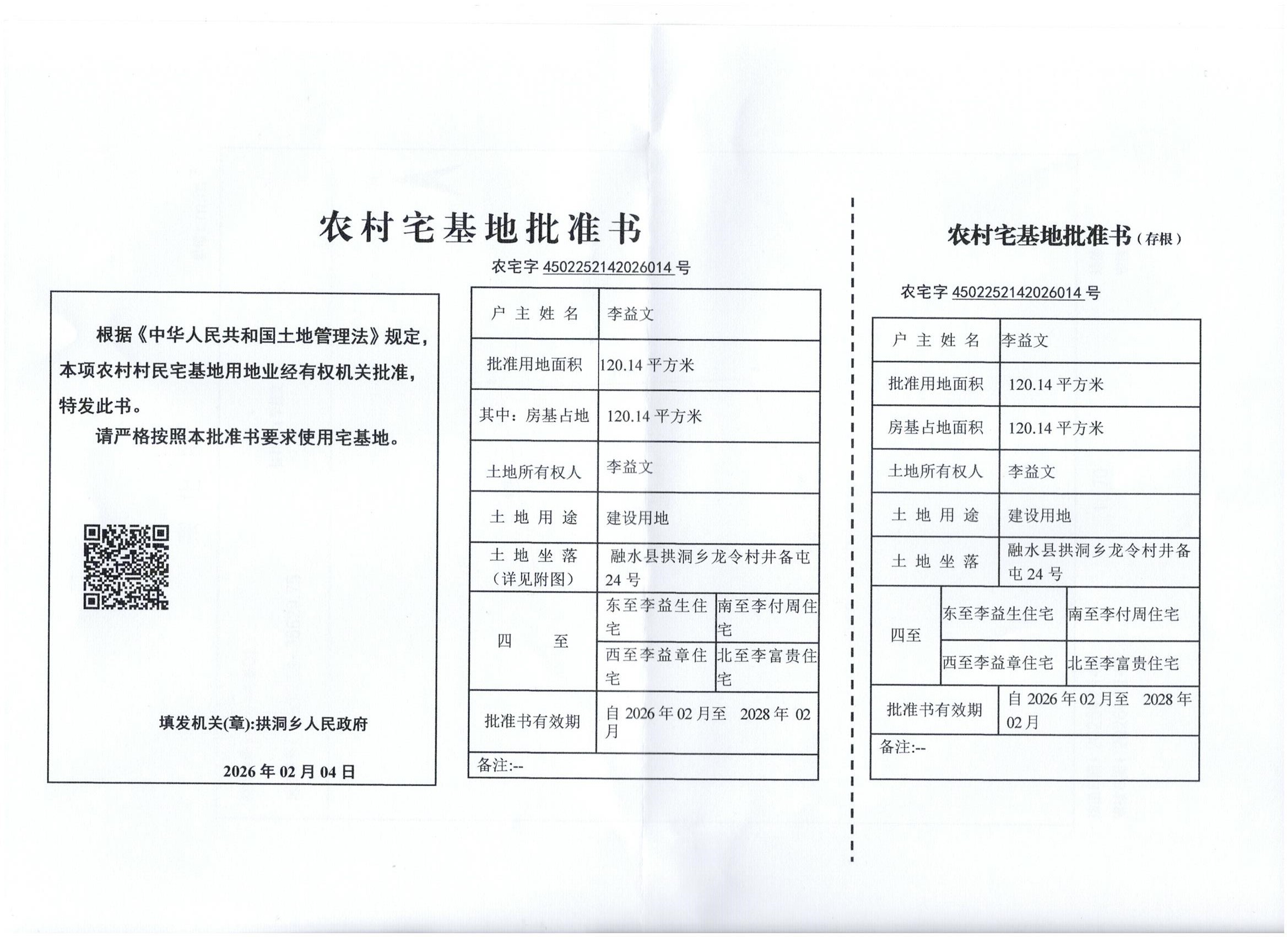 乡村建设规划许可证:乡字第4502252026XG0056654号公示