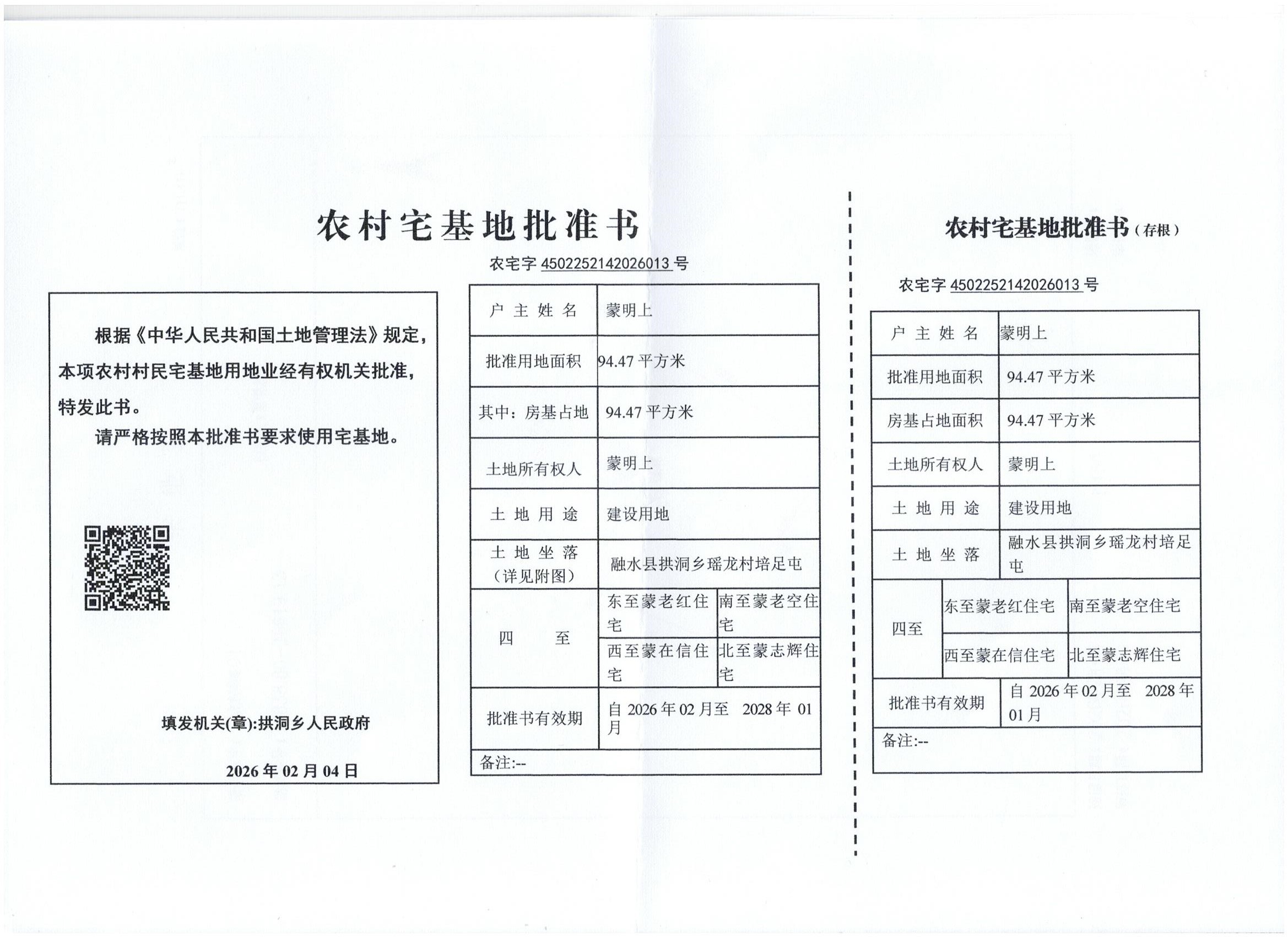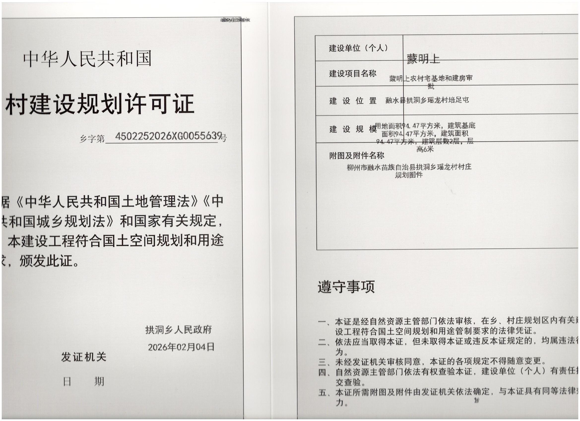 乡村建设规划许可证:乡字第4502252026XG0055639号公示