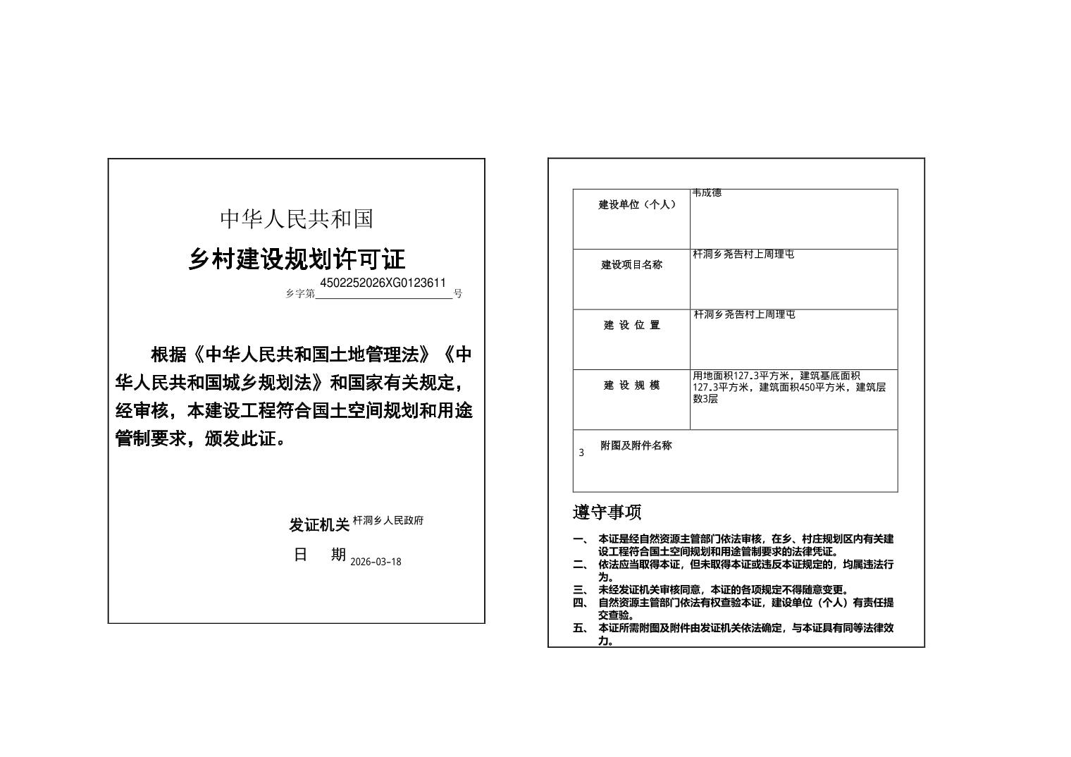 乡村建设规划许可证:乡字第4502252026XG0123611号公示