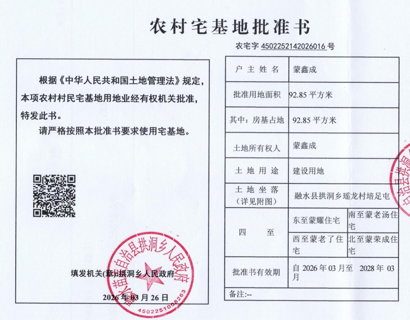 乡村建设规划许可证:乡字第4502252026XG0143677号公示