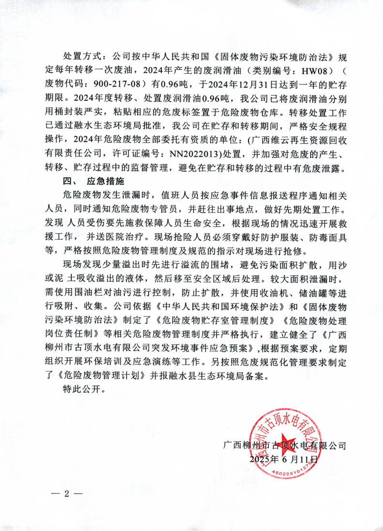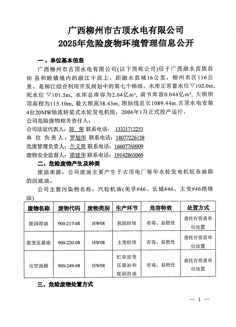 广西柳州市古顶水电有限公司2025年危险废物管理信息公开
