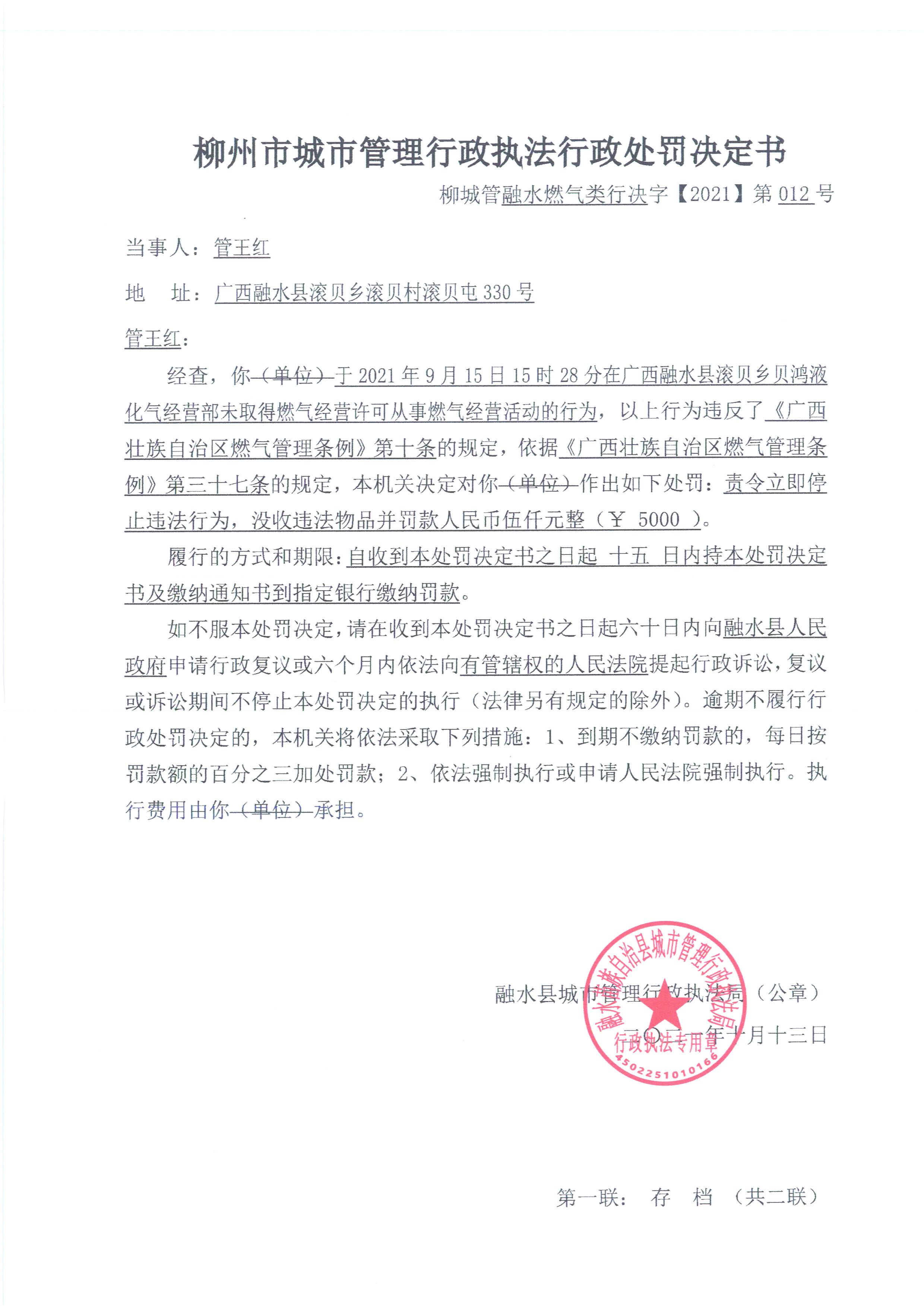 行政处罚决定书(柳城管融水燃气类行决字【2021】第012号)