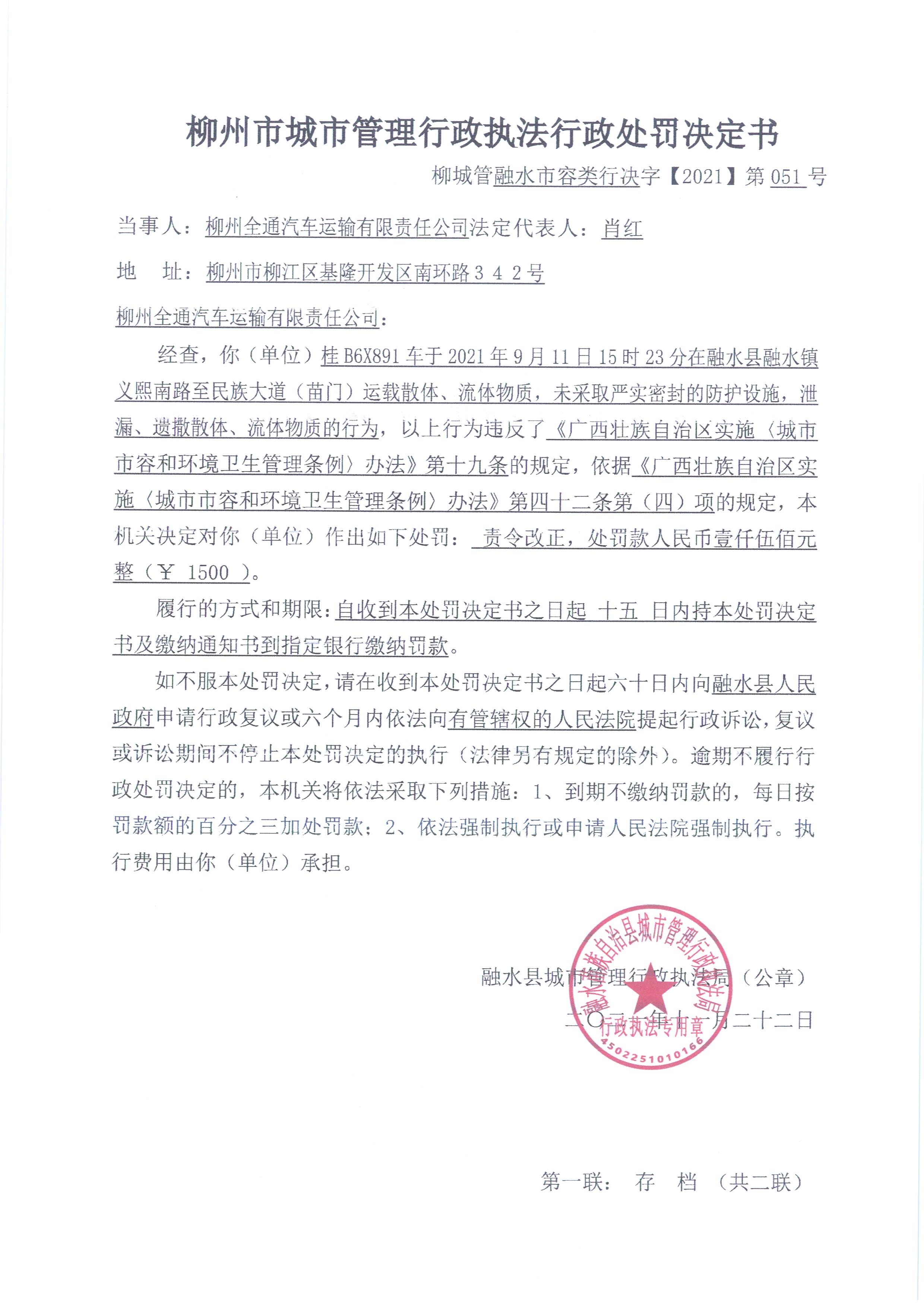 行政处罚决定书柳城管融水市容类行决字【2021】第051号