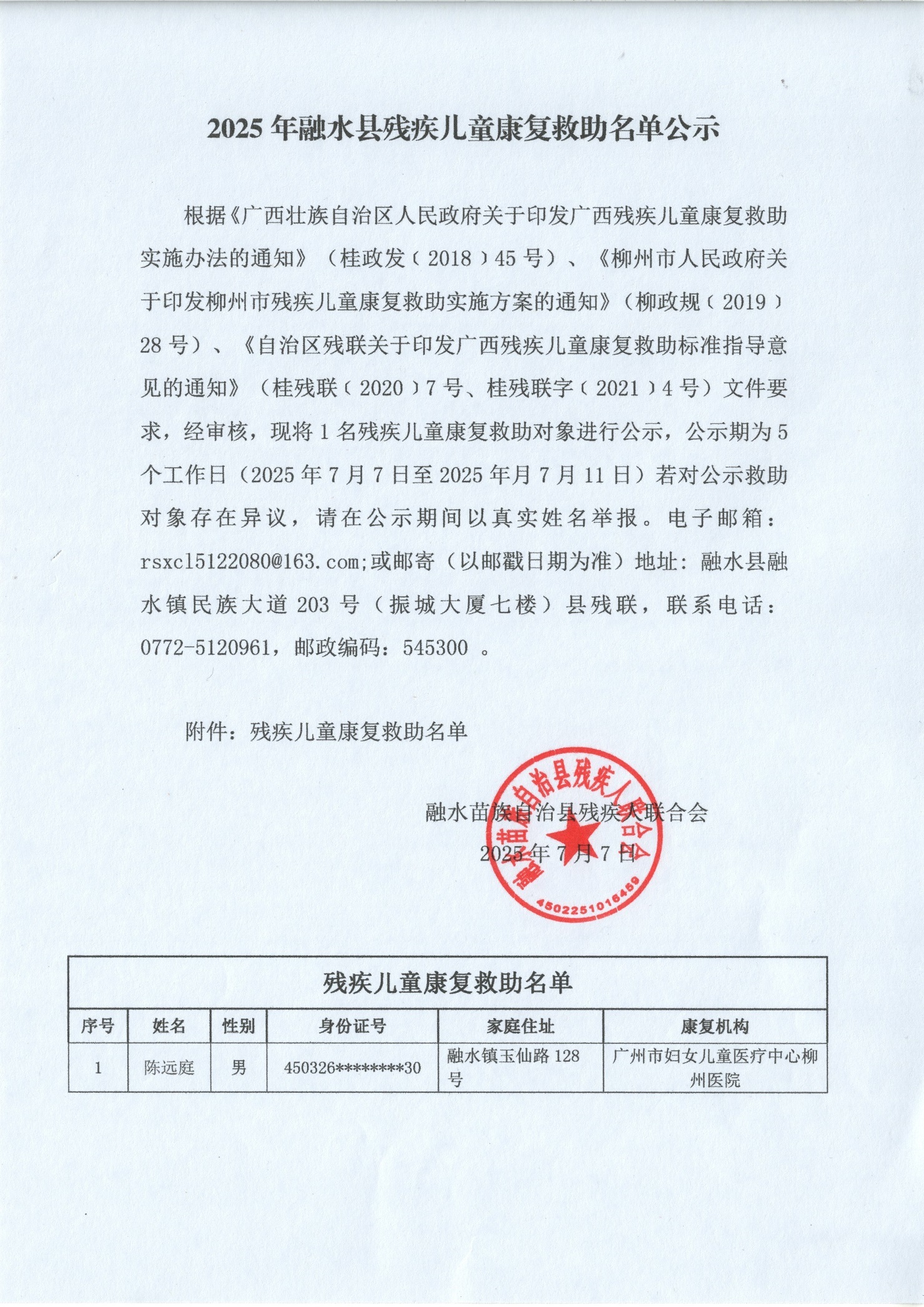2025年融水县残疾儿童康复救助名单公示2025.7.7