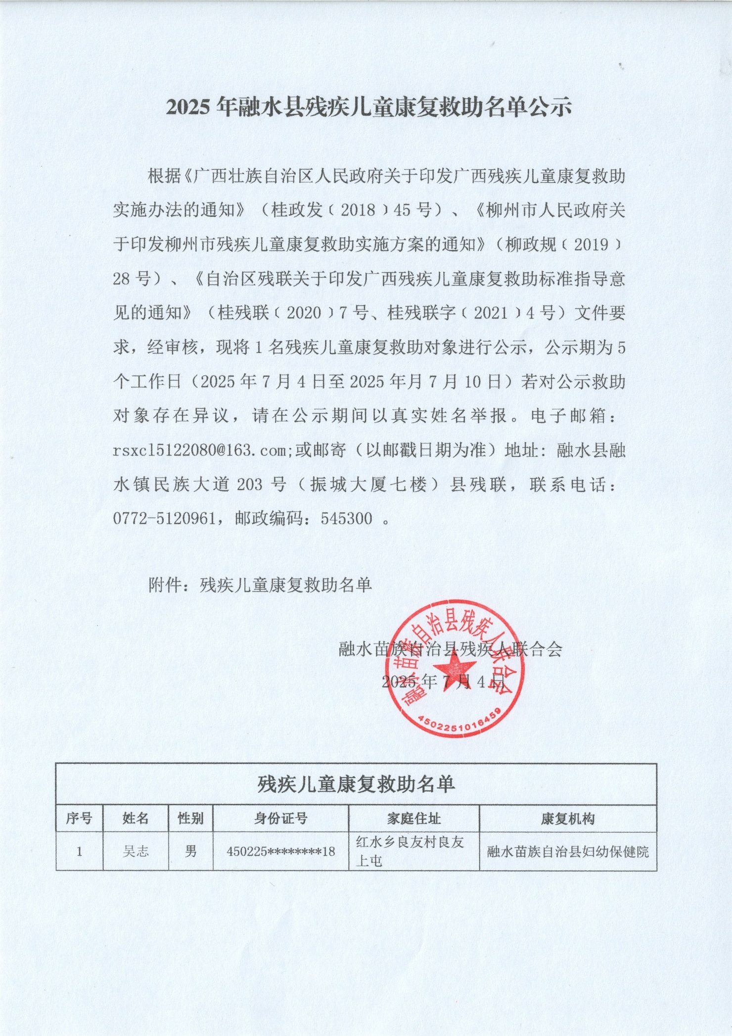 2025年融水县残疾儿童康复救助名单公示2025.7.4