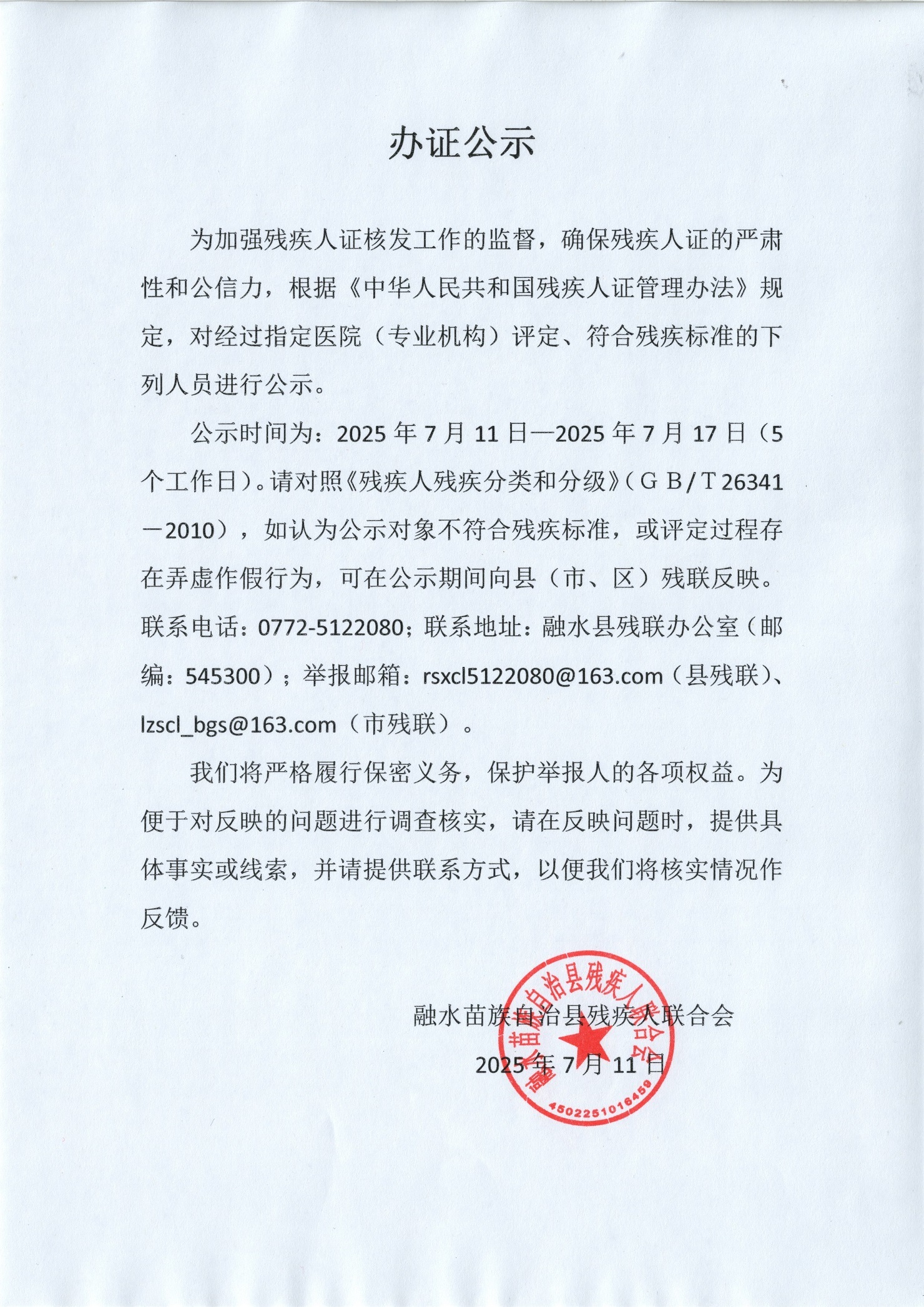 残疾人办证公示( 2025.7.11-2025.7.17)