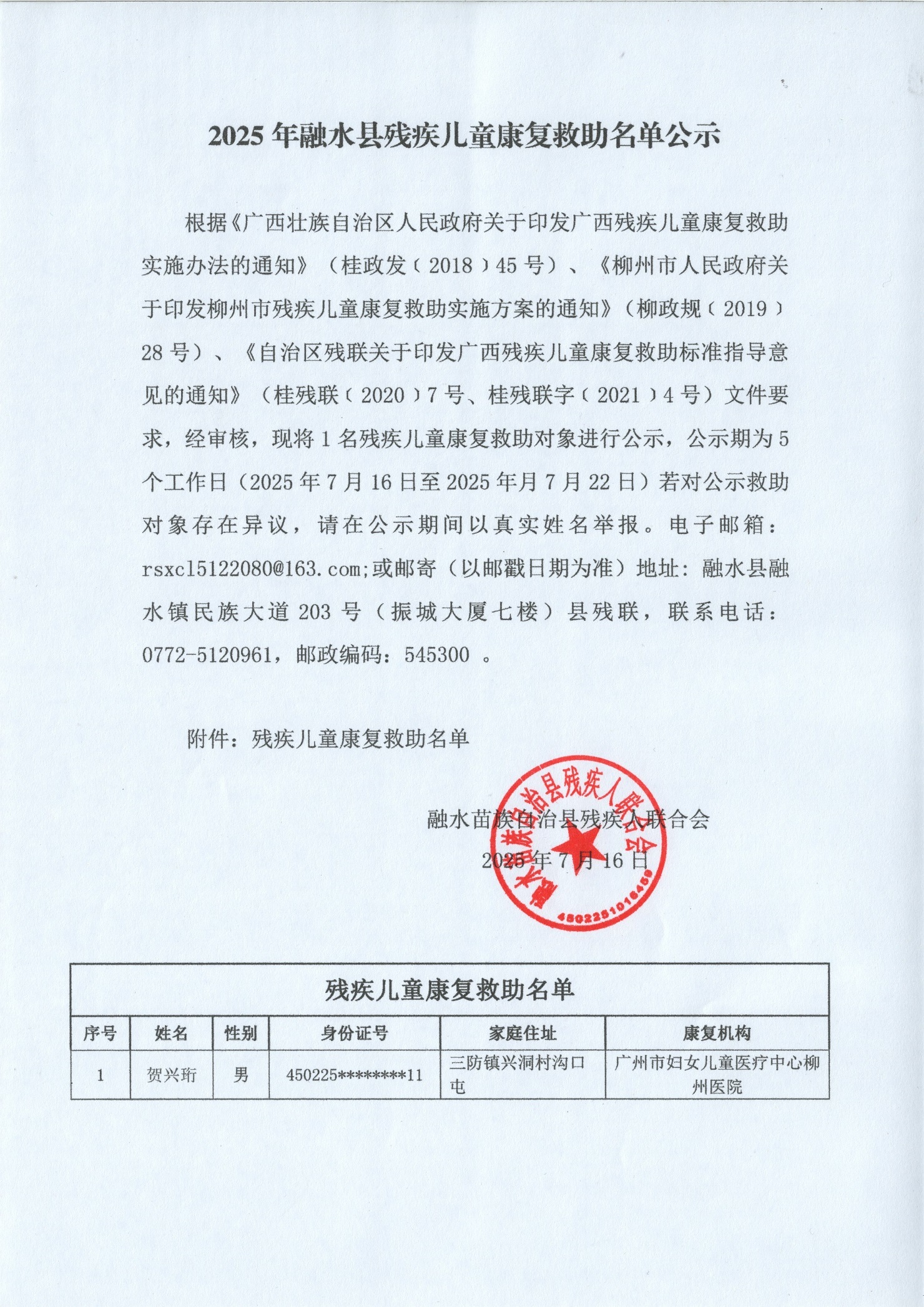 2025年融水县残疾儿童康复救助名单公示2025.7.16