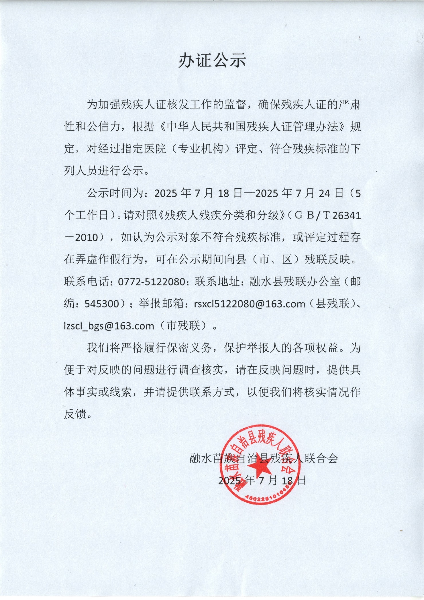 残疾人办证公示( 2025.7.18-2025.7.24)