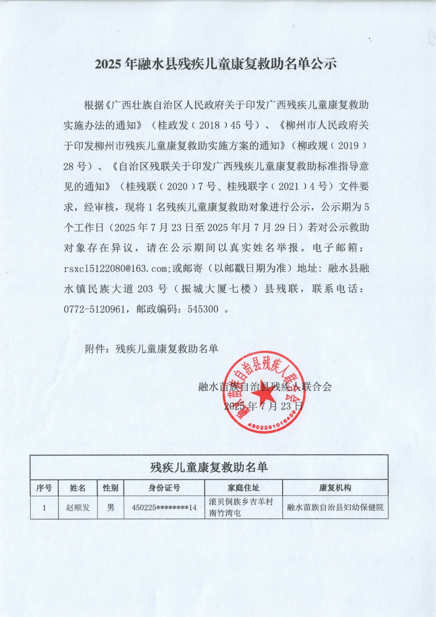 2025年融水县残疾儿童康复救助名单公示2025.7.23