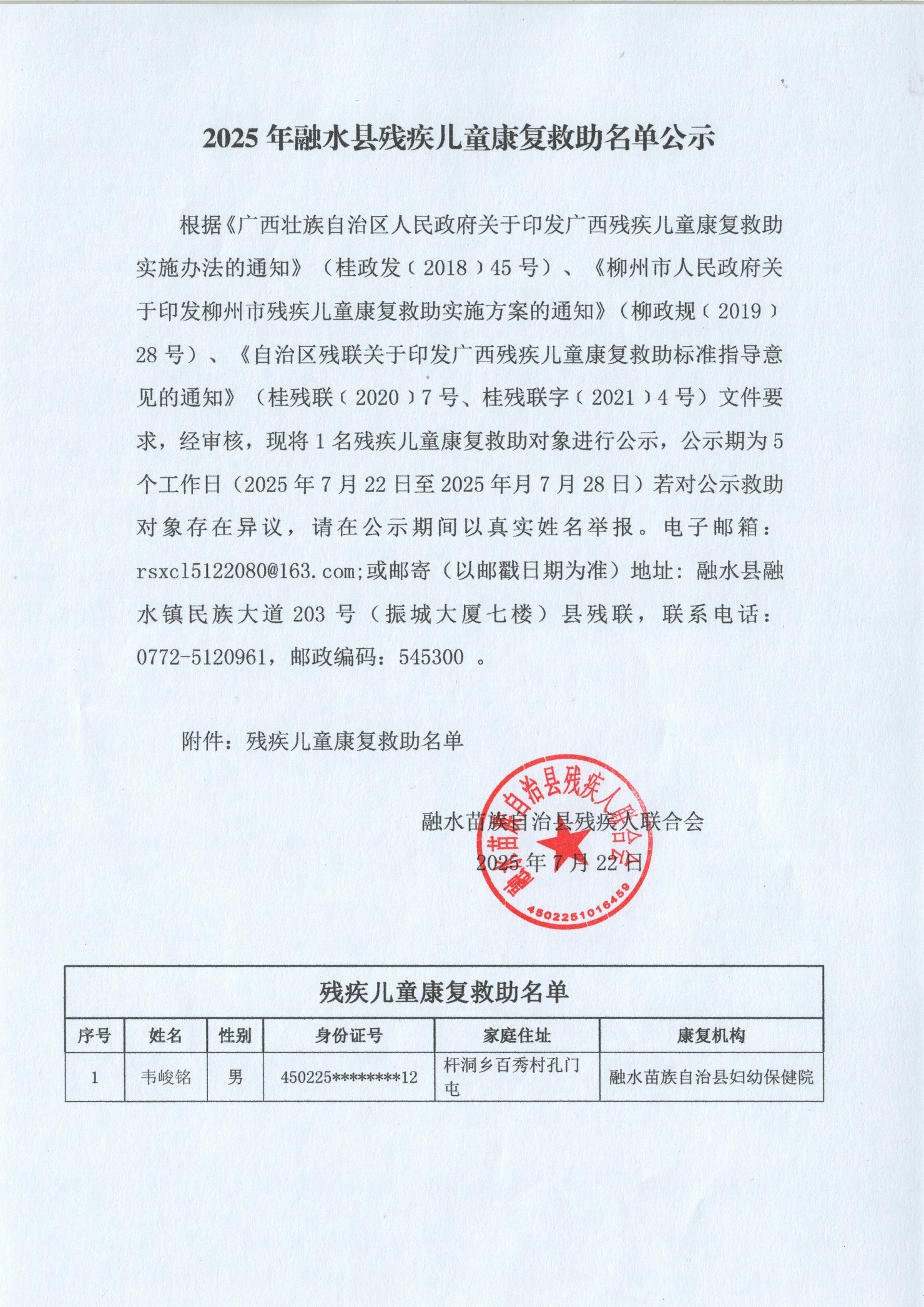 2025年融水县残疾儿童康复救助名单公示2025.7.22