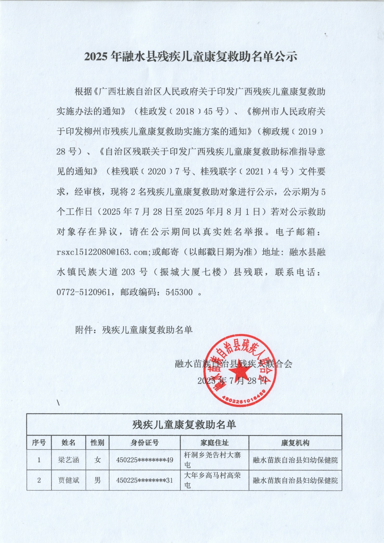 2025年融水县残疾儿童康复救助名单公示2025.7.28