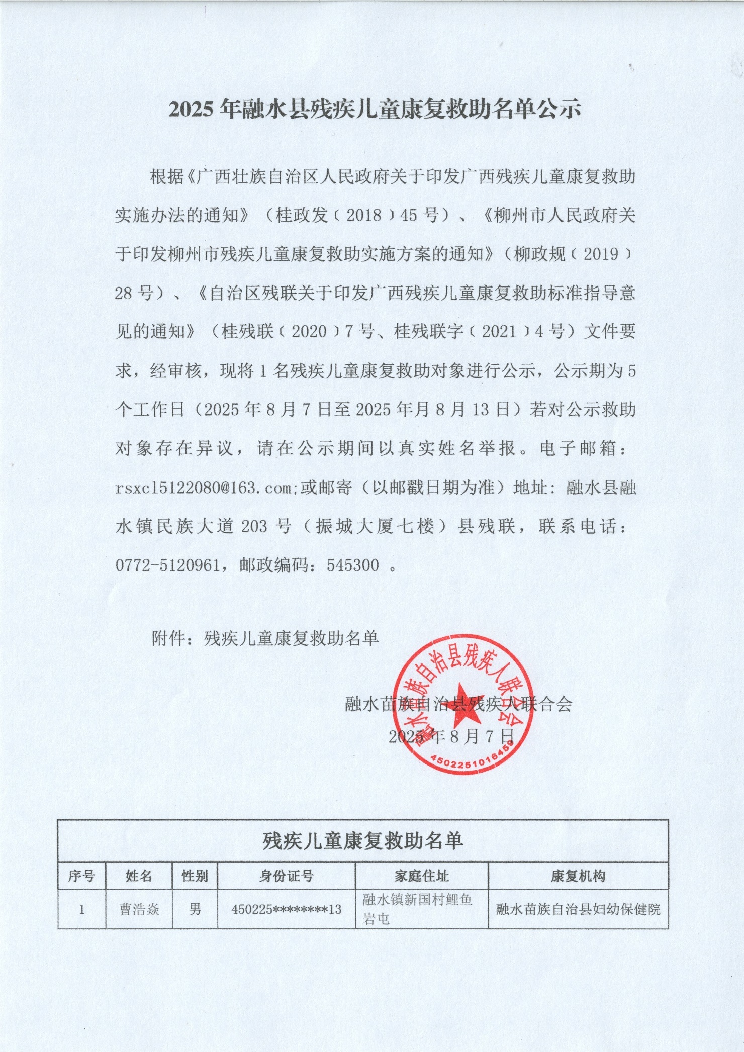2025年融水县残疾儿童康复救助名单公示2025.8.7