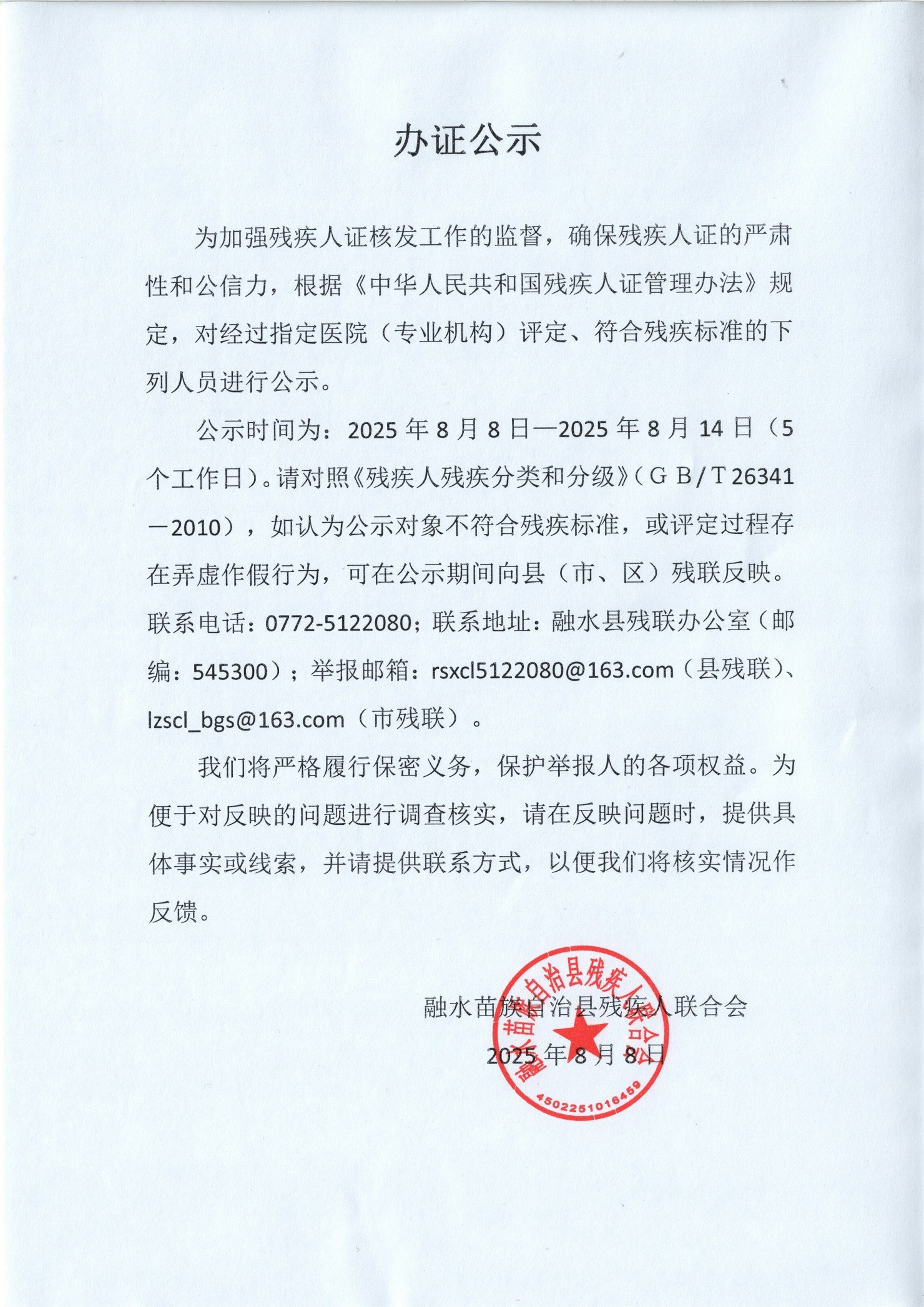 残疾人办证公示( 2025.8.8-2025.8.14)