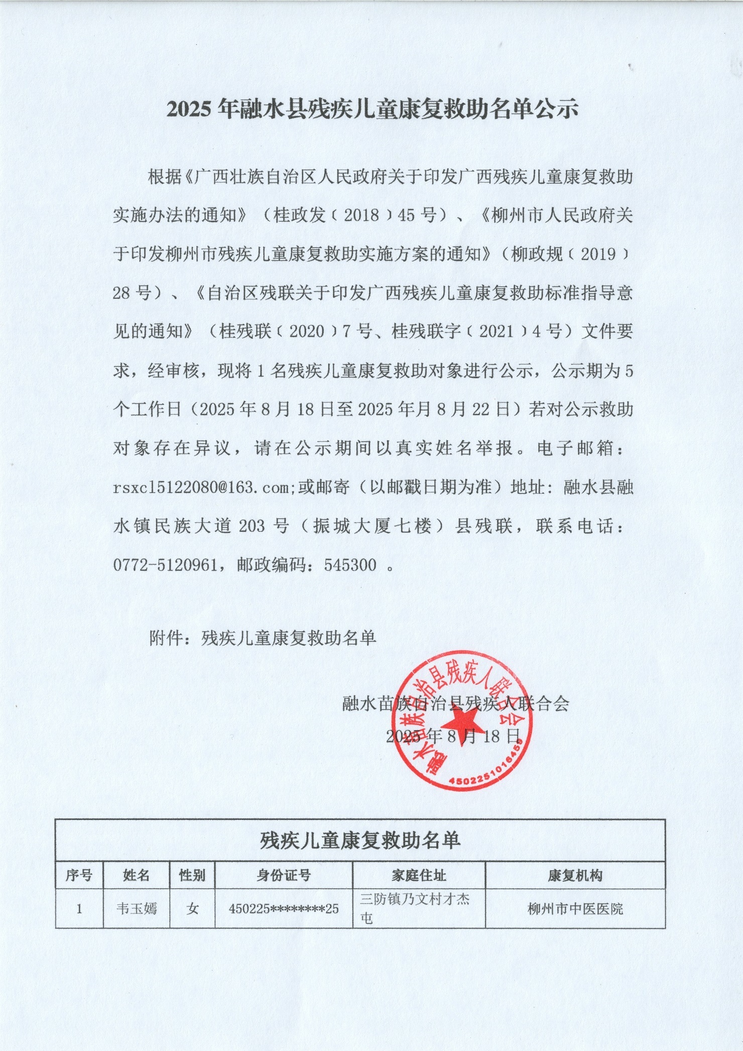 2025年融水县残疾儿童康复救助名单公示2025.8.18