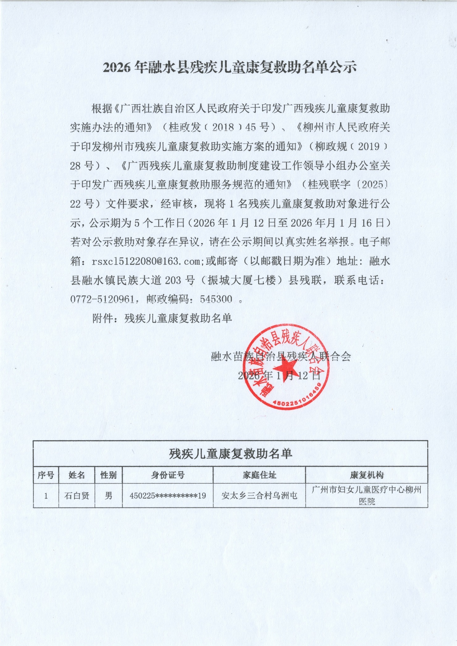 2026年融水县残疾儿童康复救助名单公示2026.1.12