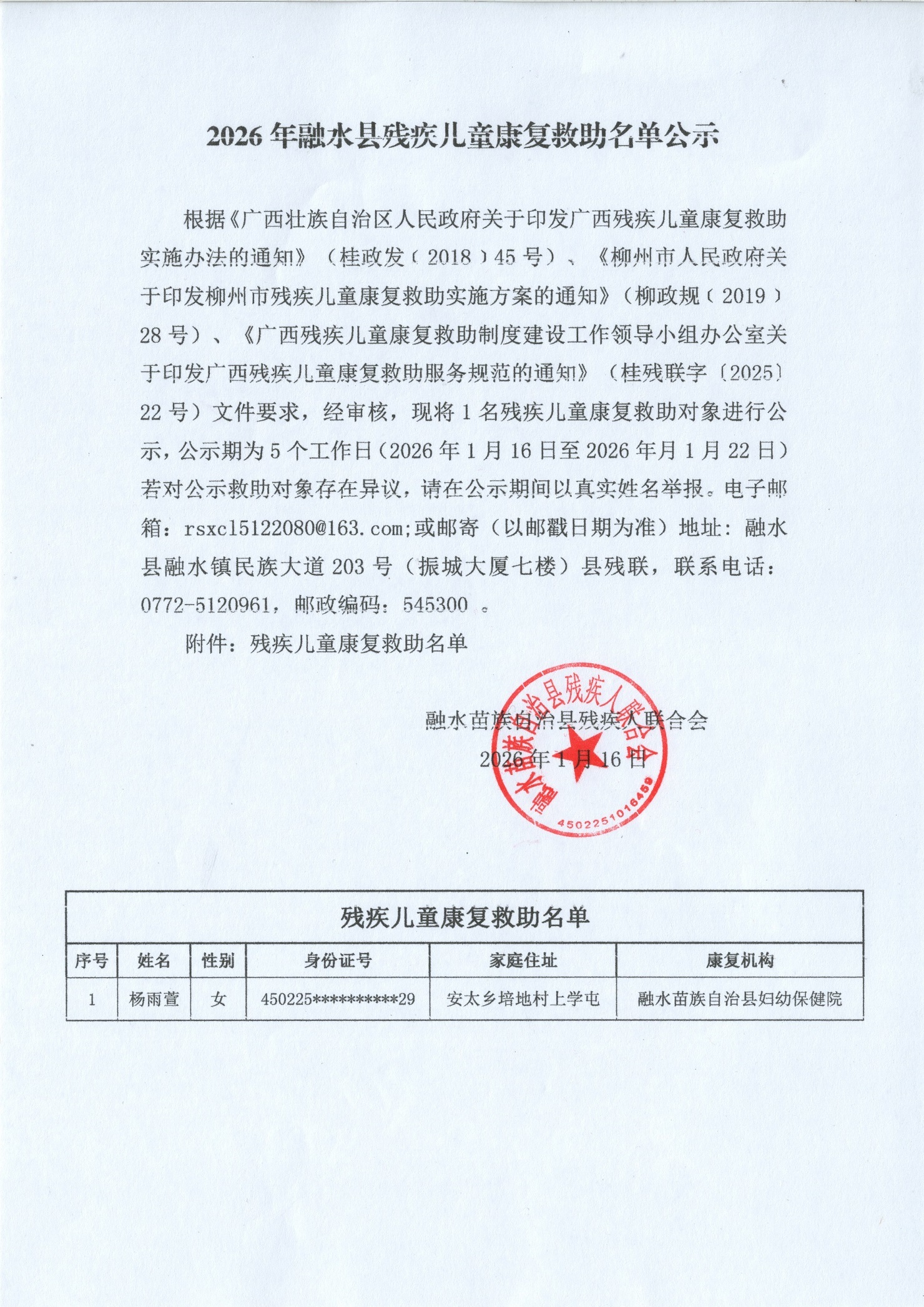2026年融水县残疾儿童康复救助名单公示2026.1.16
