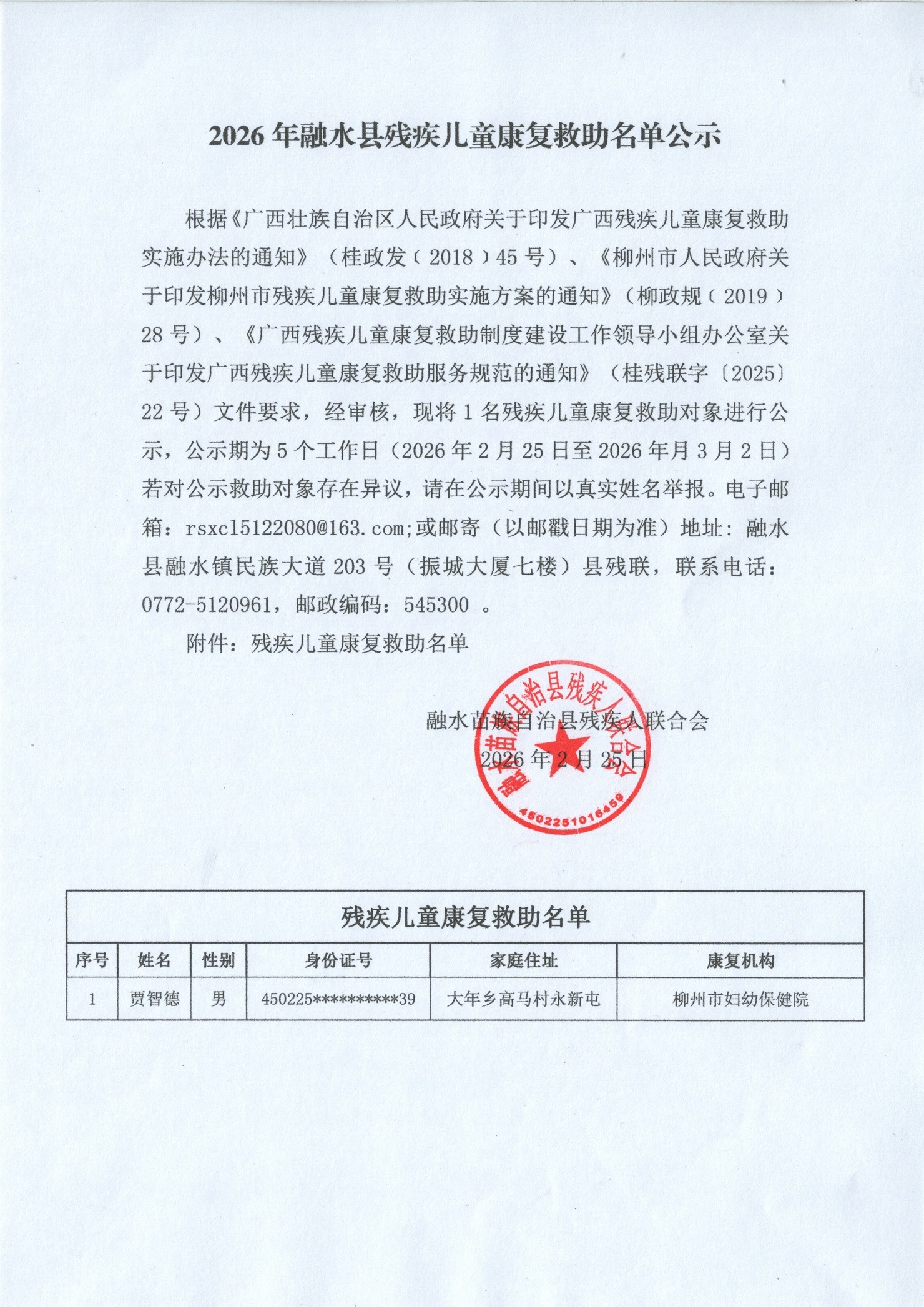 2026年融水县残疾儿童康复救助名单公示2026.2.25