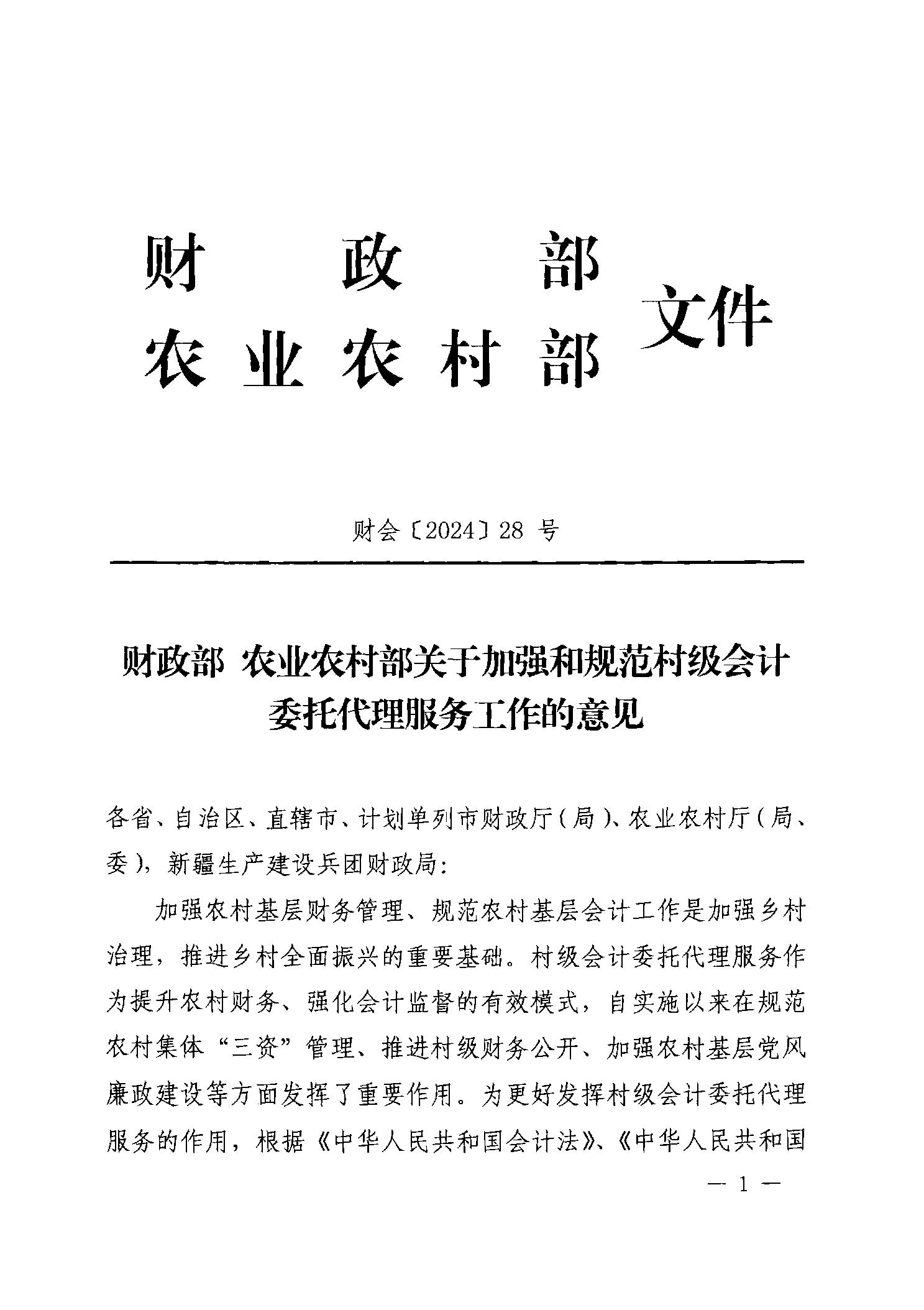 财会〔2024〕28号关于加强和规范村级会计委托代理服务工作的意见