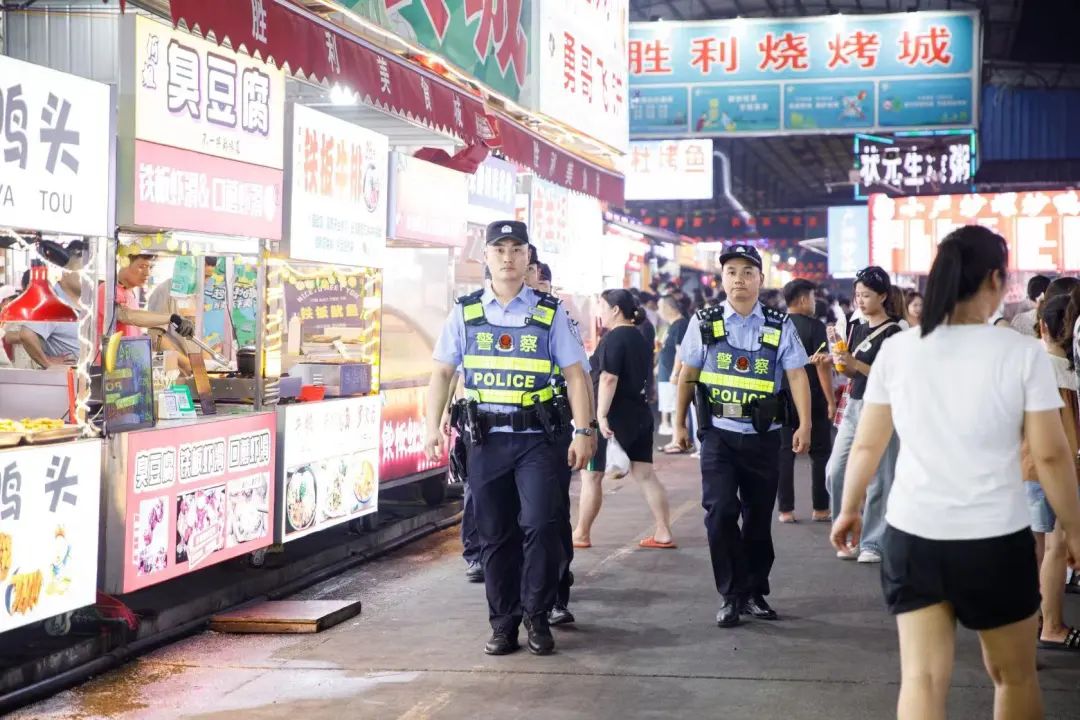 ● 烧烤、炒冰、螺蛳粉、炒鸭脚……暮色四合、华灯初上。位于柳北区的“胜利烧烤城”,一辆警车停在街头警灯闪烁,胜利派出所民警辅警正在徒步巡逻。“每天有警察巡逻,夜市人气旺,我们生意好,我要为柳州警察点个大大的赞!”一夜市摊主由衷赞叹。