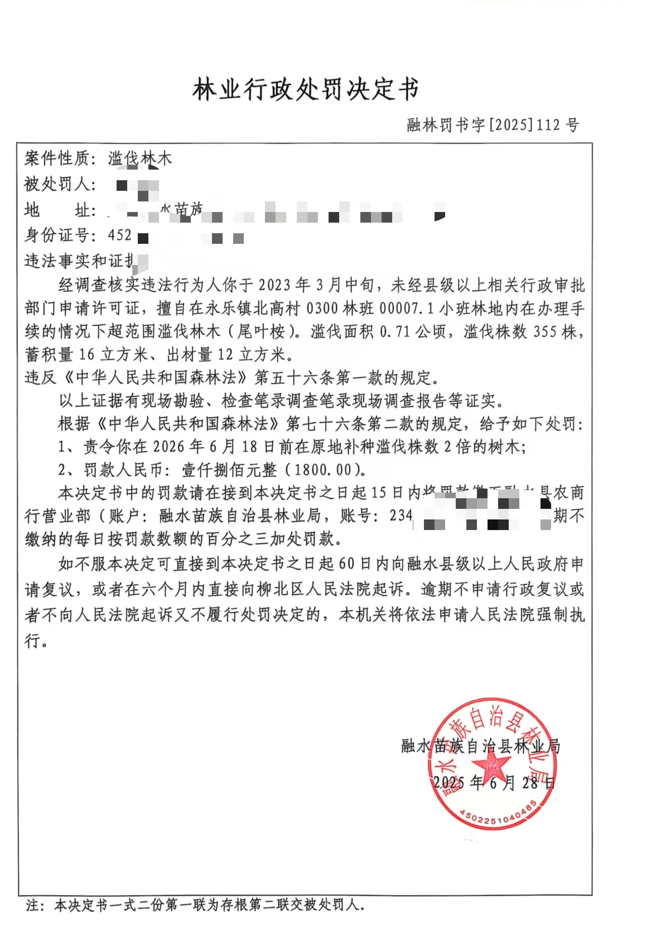 林业行政处罚决定书 (融林罚书字[2025]112号)