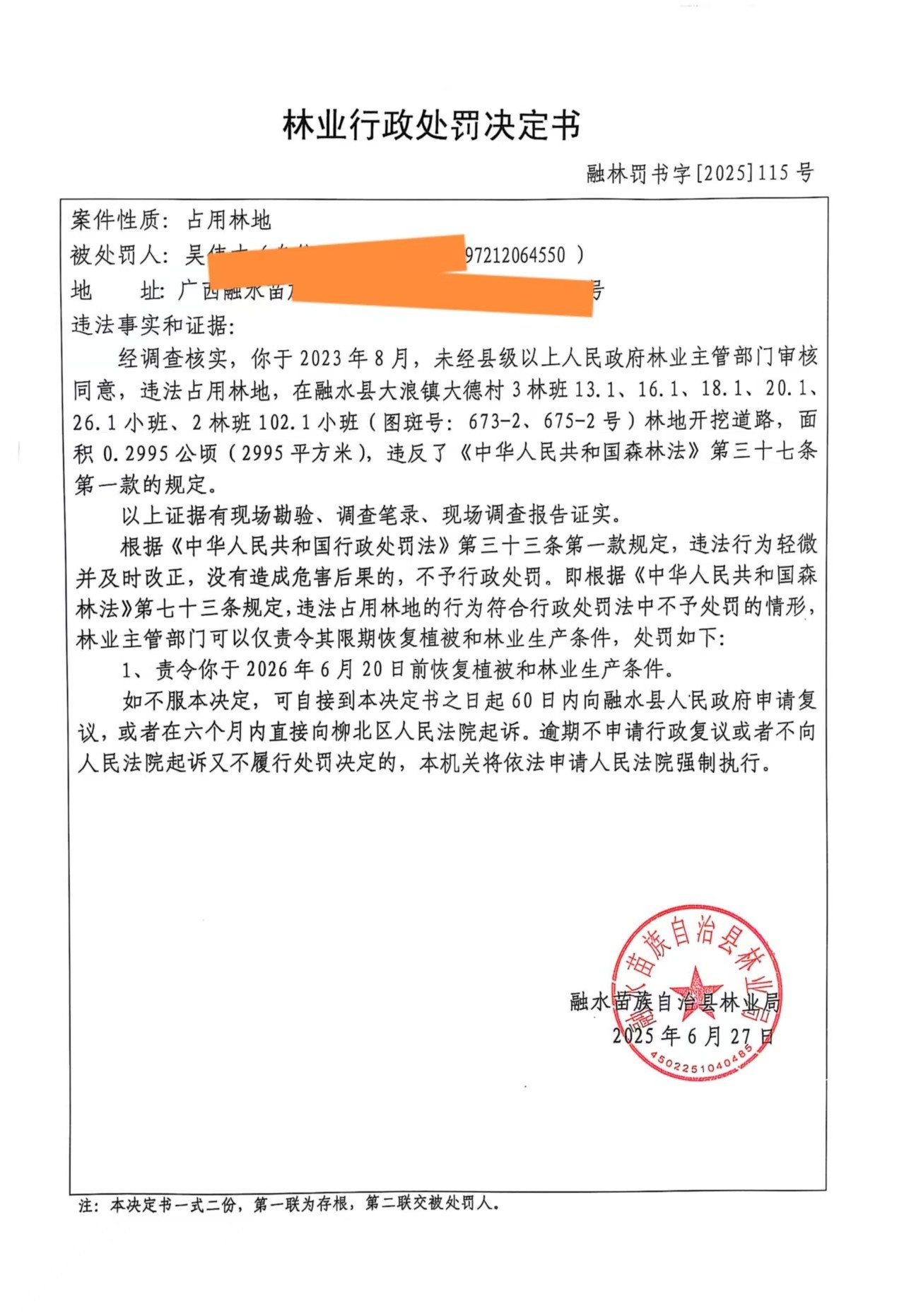 林业行政处罚决定书 (融林罚书字[2025]115号)