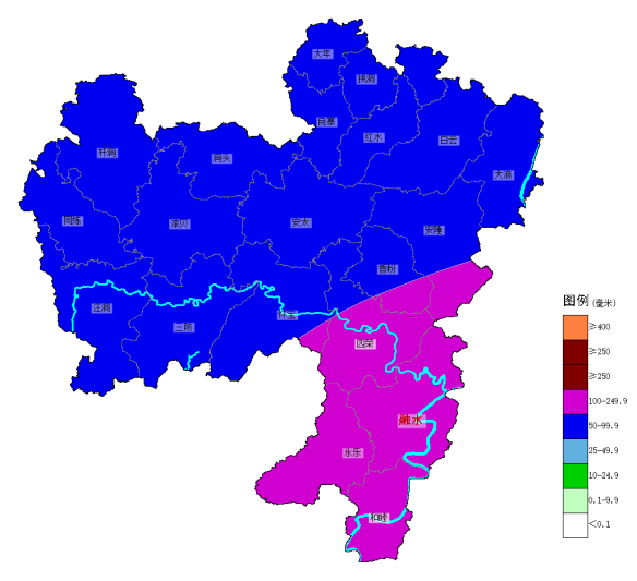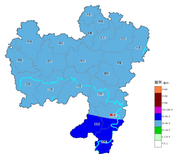 18日晚到19日白天,全县有暴雨、局地大暴雨到特大暴雨,并伴有短时雷暴大风等强对流天气。最大可能出现大暴雨以上的乡镇有(附图2):和睦、永乐、融水、四荣等。